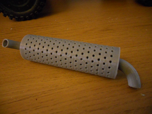 Seeing as the print quality has improved, I re-printed the exhaust with a different design, offset rows of holes, which is a bit more realistic. Took about 7 hours, but it came out well. You can see a line where I ramped up the print speed, but its only a minor glitch.