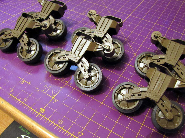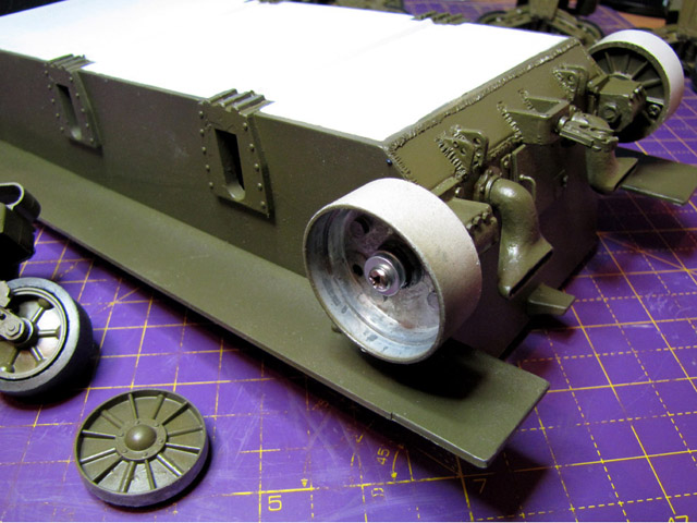 - Here is an example of the wheels now assembled on the pivot arms. The springs, sliding arms, etc, are yet to be added. As can be seen, all the pivoting points, including the return roller, have been lightly lubricated (moly - the excess is cleaned up before putting back in the hull of course)