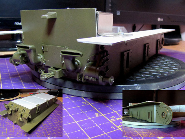 - The next step was to paint the lower hull tub. For this, as for the rest of the tank, I used first a coat of Mr Hobby metal primer followed by Vallejo grey surface primer, and top coats of Mig Ammo dark base and base olive drab. I finished this (for now) with light coats of Vallejo satin vanish (these pictures taken under florescent/tungsten are showing the colour lighter/different than it is - I'll hopefully get better ones later)