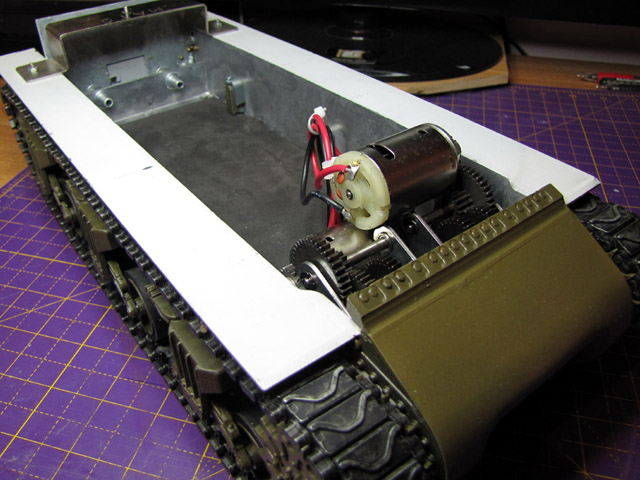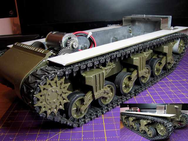 is the little metal tabs (there is one on the other side too) fixed to the hull wall and the cutaway on the rear bracket, both will be explained in due course. Next I made a two-piece removal clear perspex upper deck. This fits tightly between the rear idler adjuster nuts and is conveniently supported by the horseshoe blocks securing the bogies in place. The second picture better explains this.