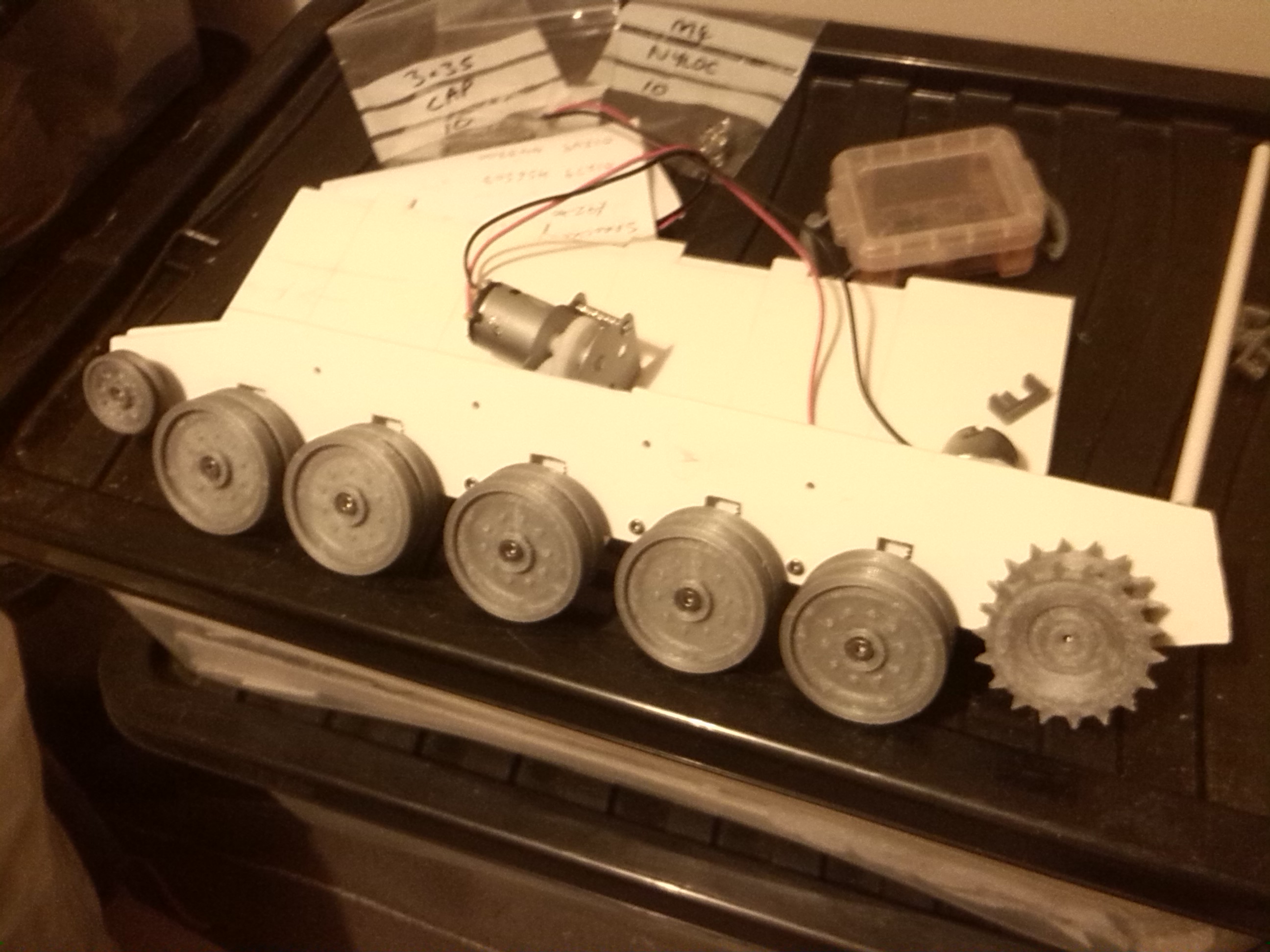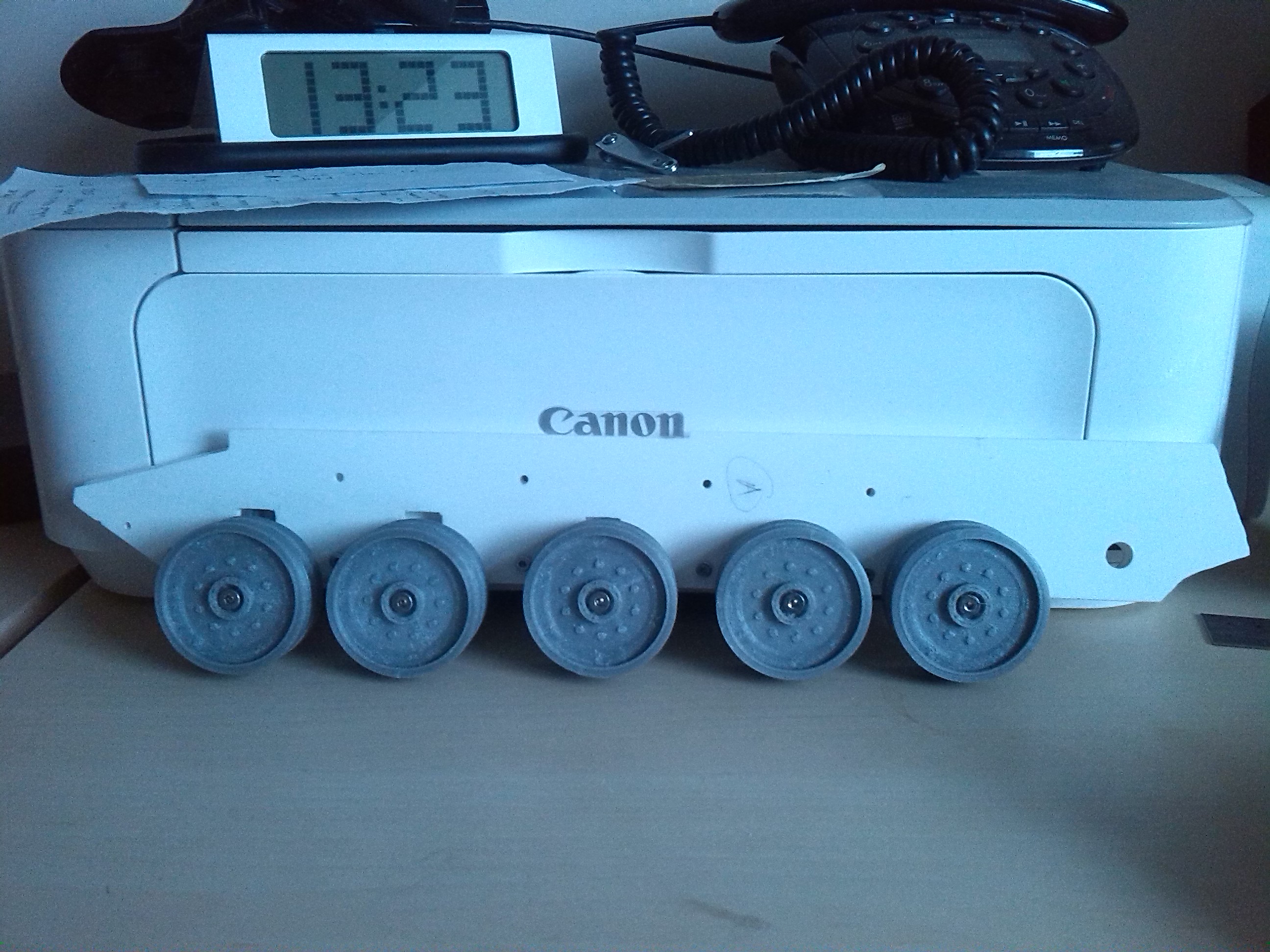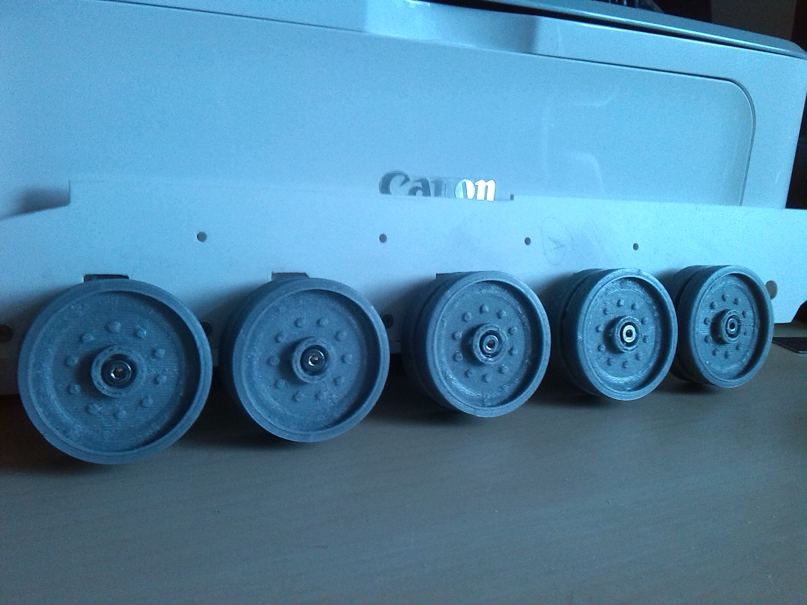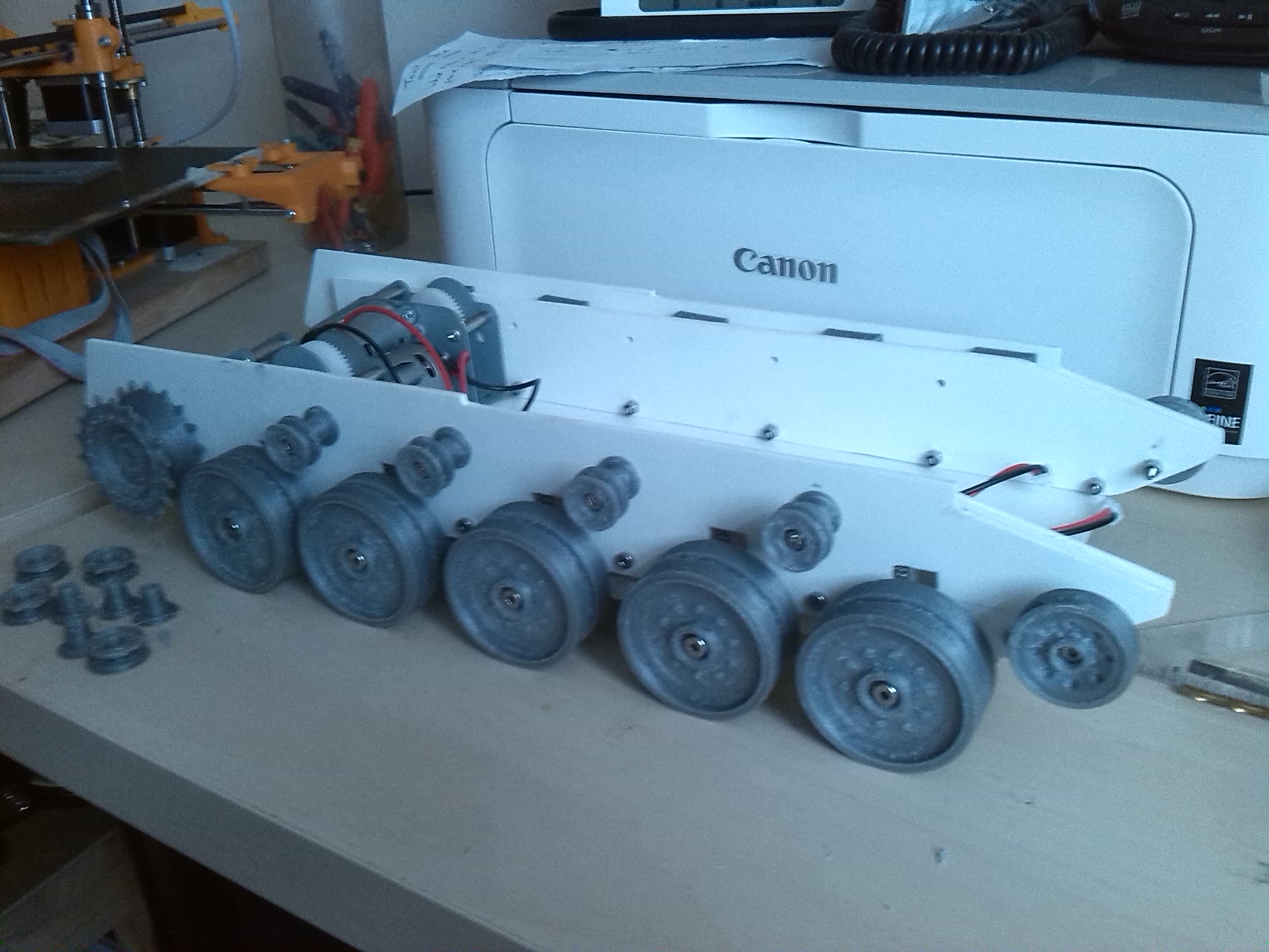 My poor printer has been going from morning till night for days. Fully assembled one side, all working suspension, and everything lines up so the tracks should stay on the wheels and sprockets. Still need to do the return rollers and spacers, I''ll get on to that tomorrow.