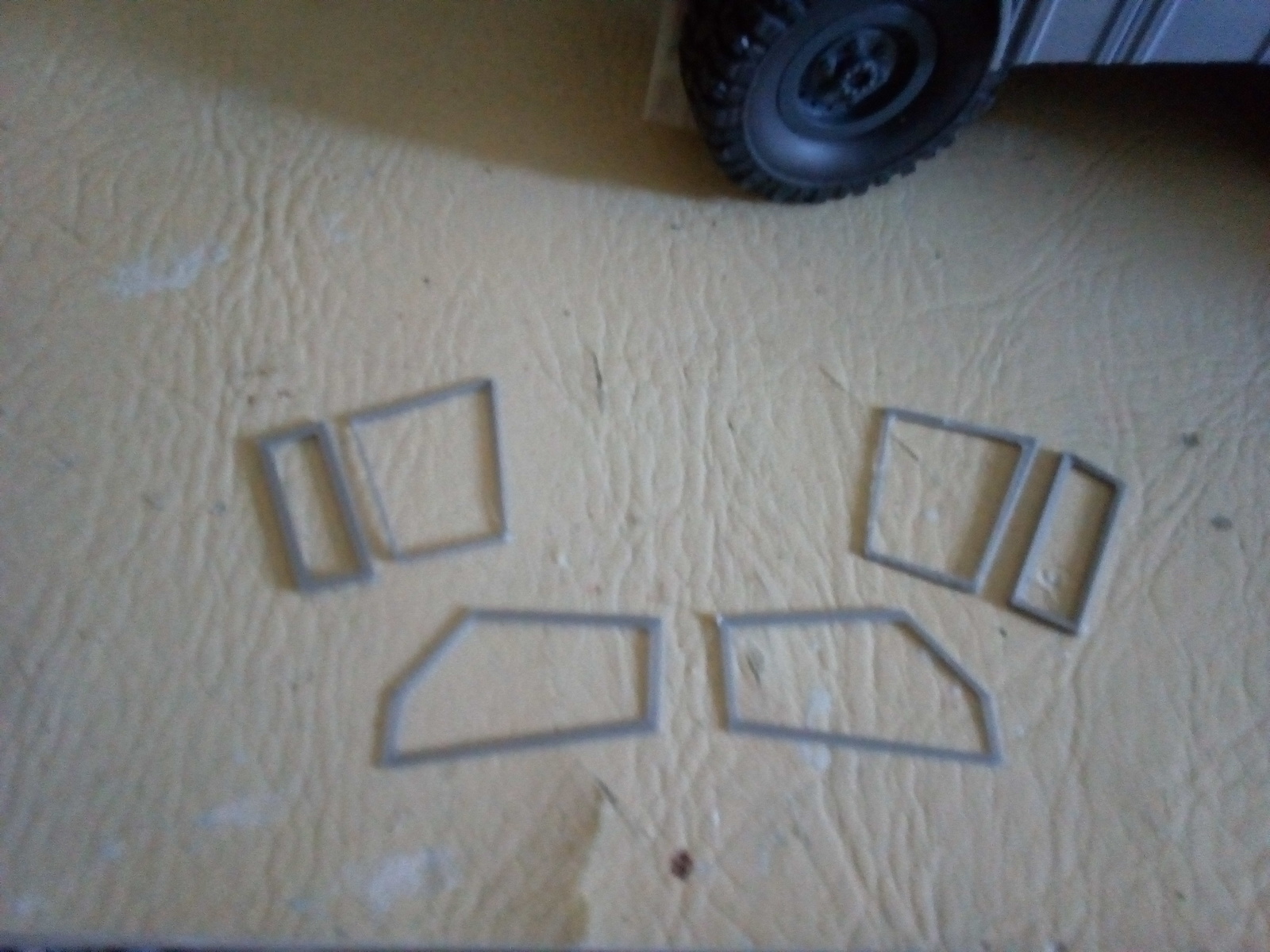 Tyres arrived, so fitted those. Did some window frames, and will use a supermarket salad container for the glass, the frames have a recess to take the panes.