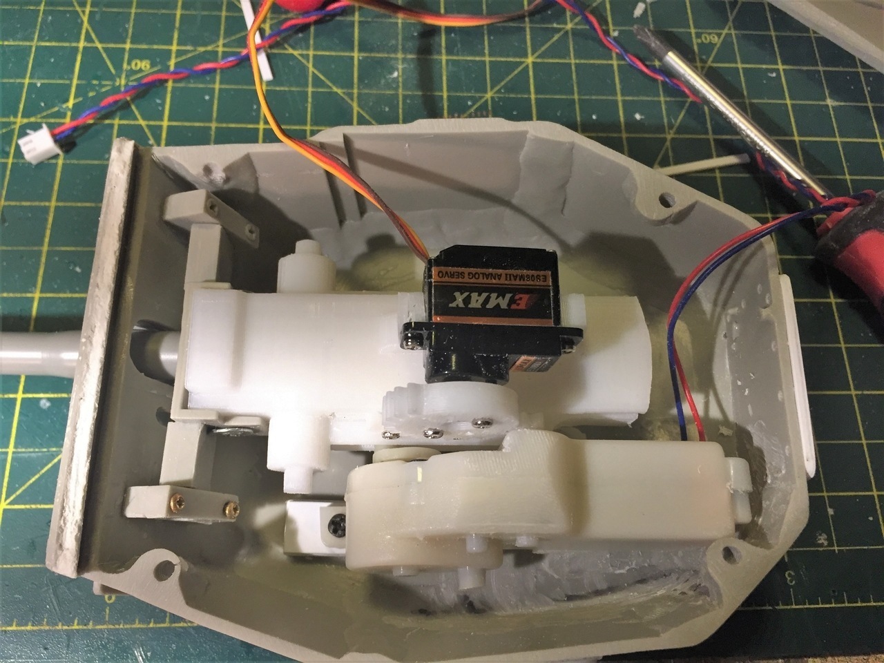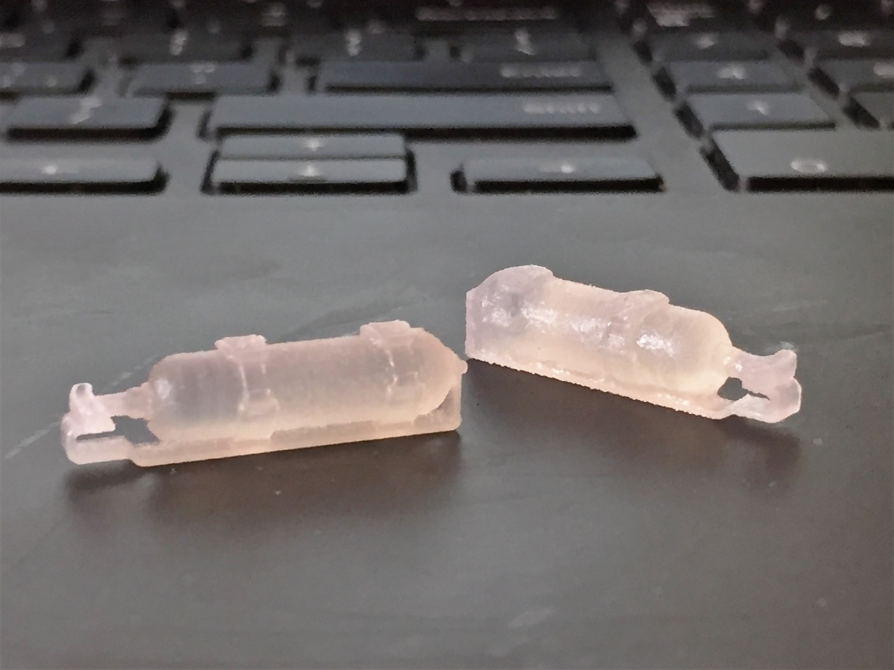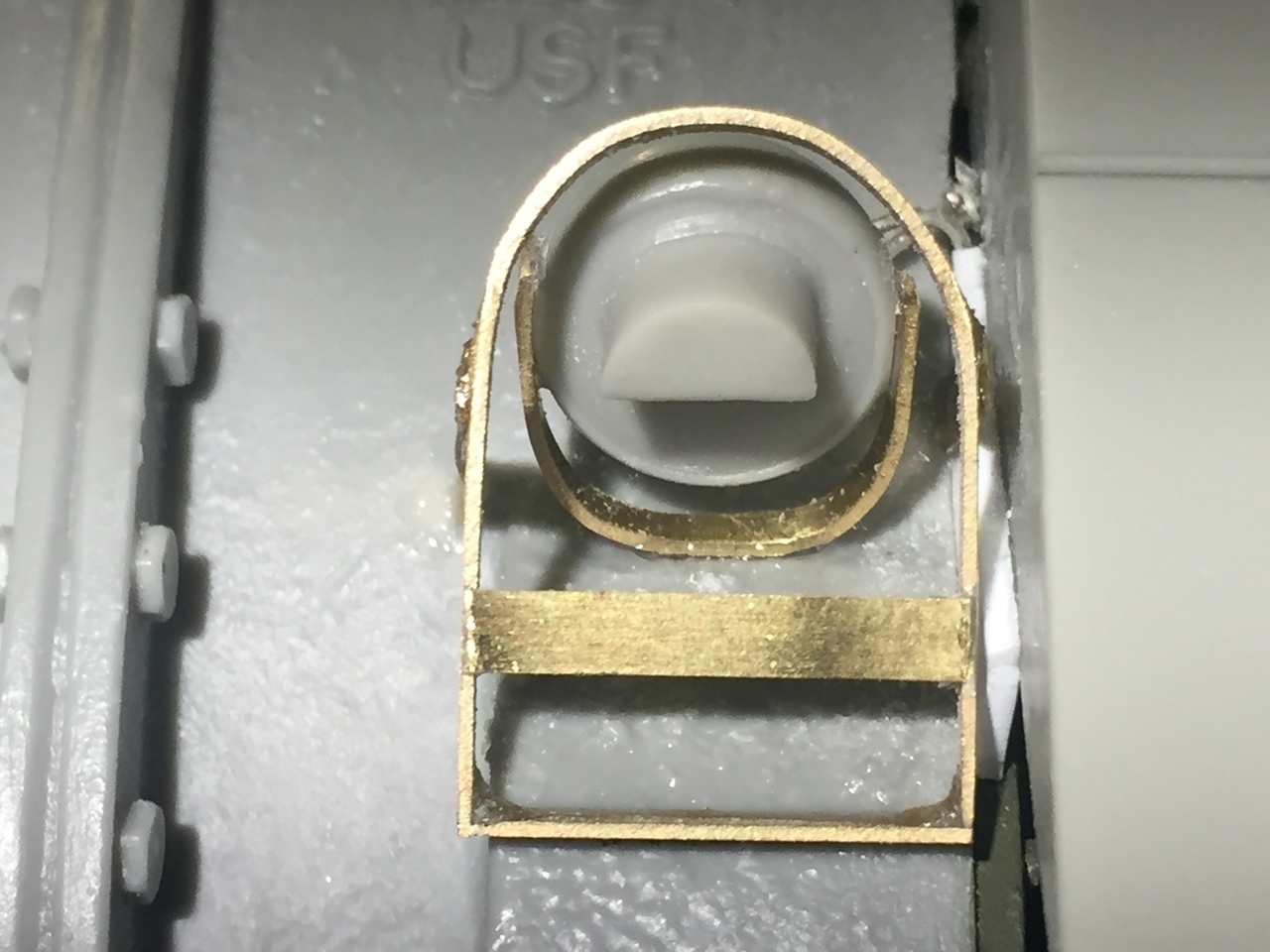 The spring housings were cut with a metal saw (not the blade) and will then be sanded up to the middle of the small hole that you above, a significant reduction. Notice also that the center of the Shapeways part was made hollowed using a small Dremel drum sander.