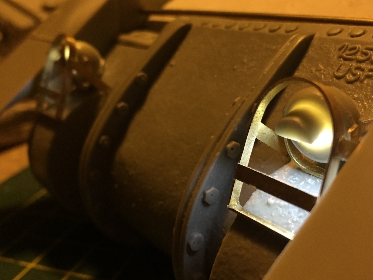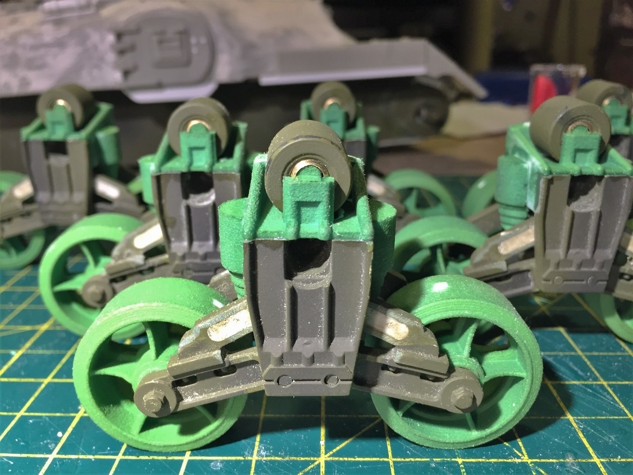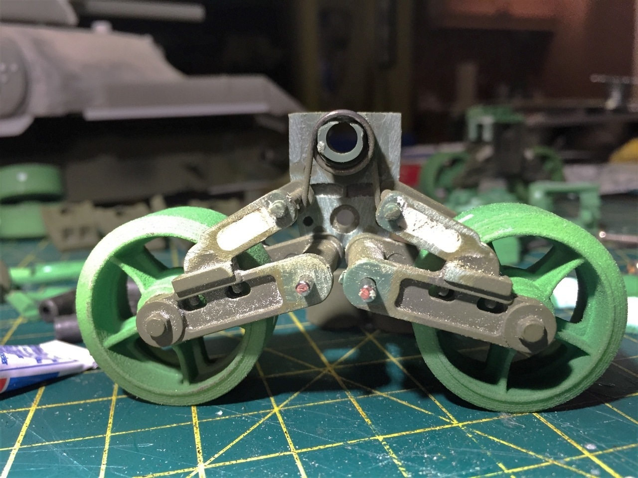 The fake spring parts are trimmed because they were interfering with the suspension spring, and then glued into their housing as shown. They are then ready to be installed back on the bogies.