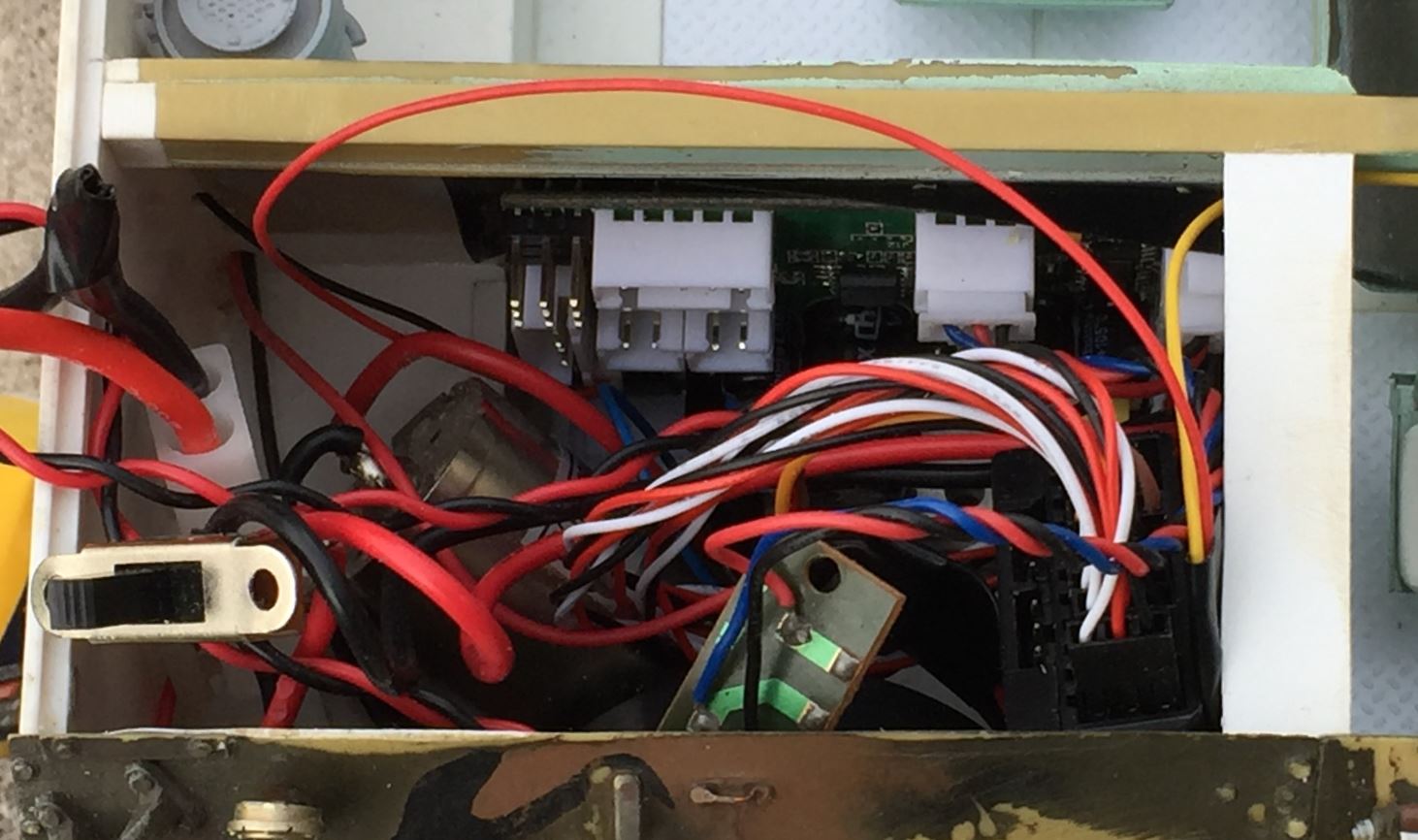 Here, a Clark TK-20 series Control unit is installed against the bulkhead. The Flysky receiver is on the right. All the connections have been made and awaiting placement.