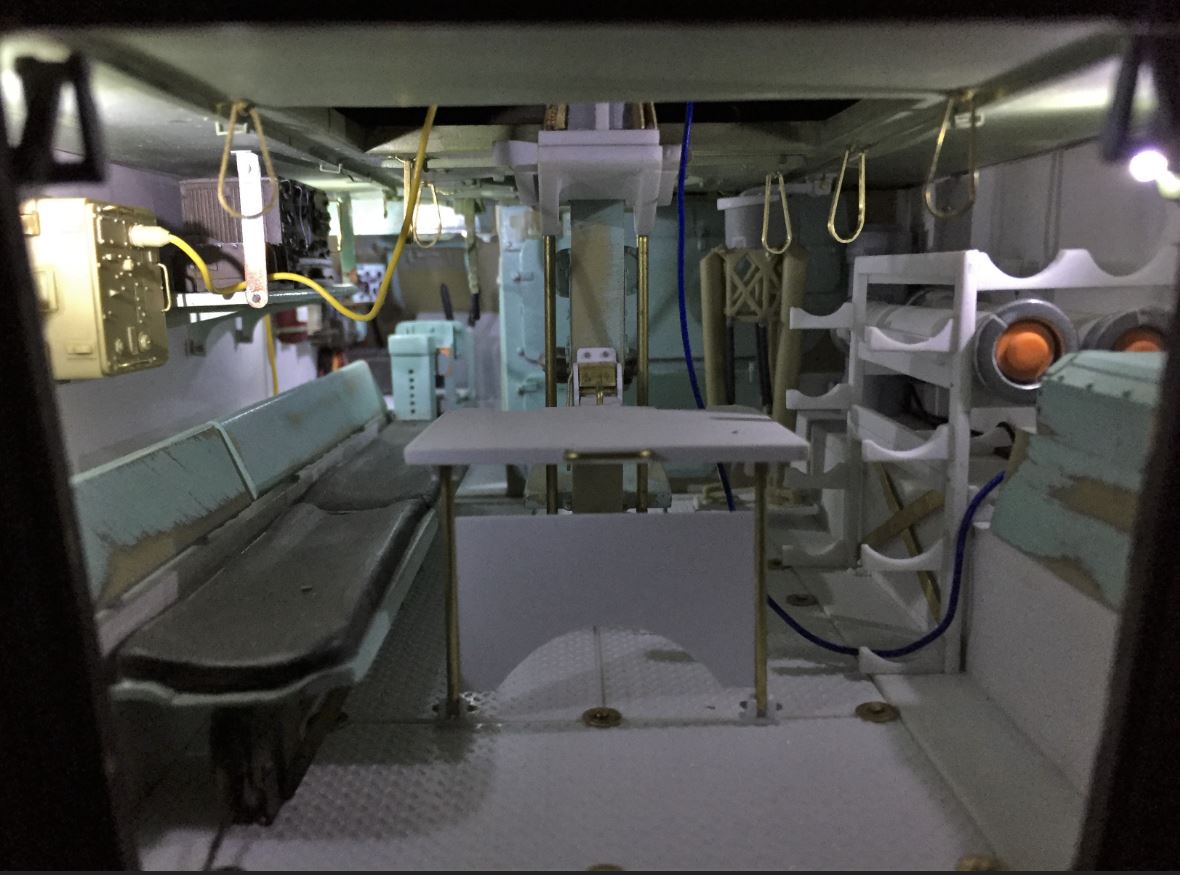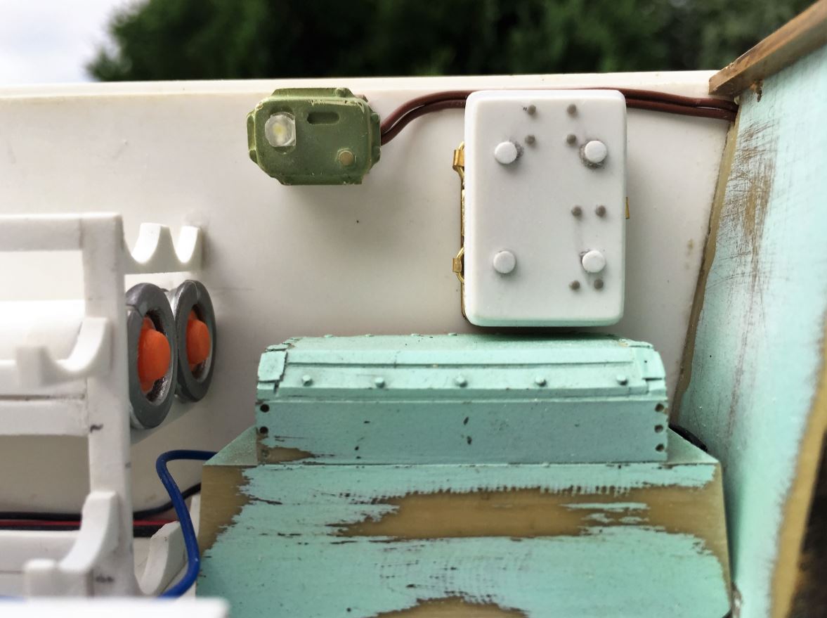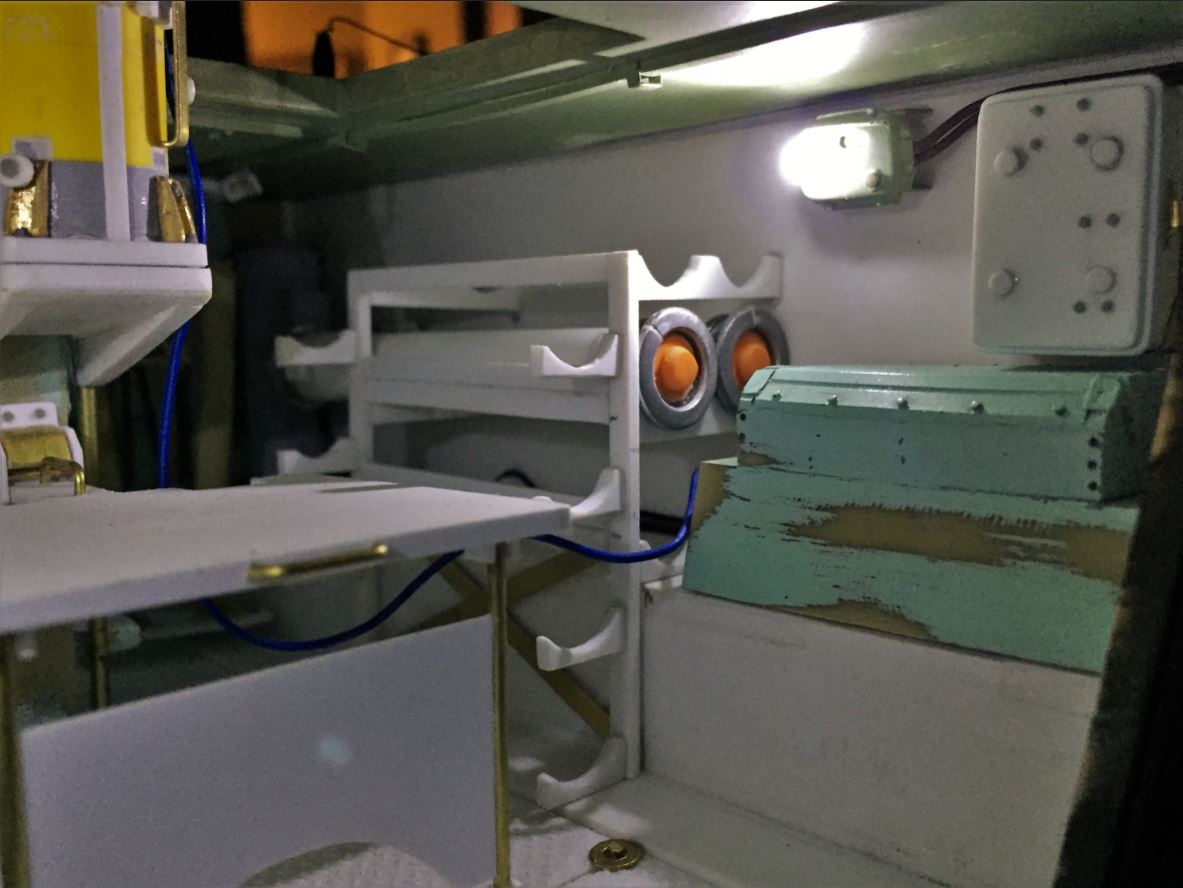 A LED had been inserted in the very visible interior light at the back, drilled through the Verlinden resin part . I was forced to mount it on the wall instead of the roof because the roof is removable and i do not want any wiring attached to it.