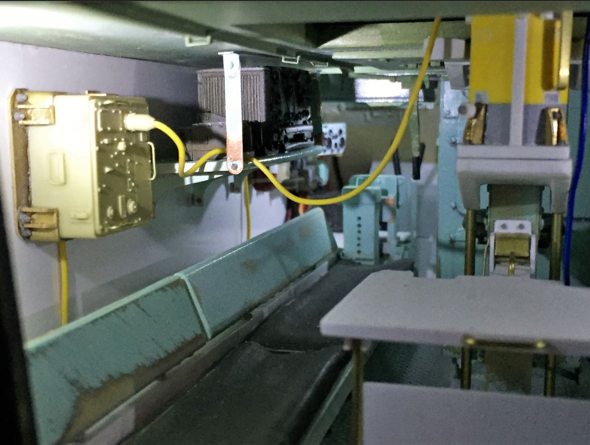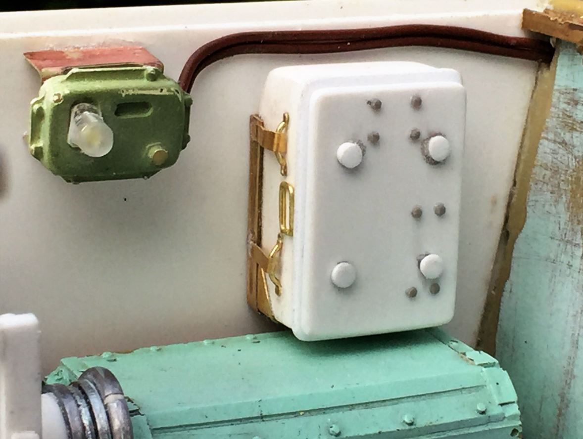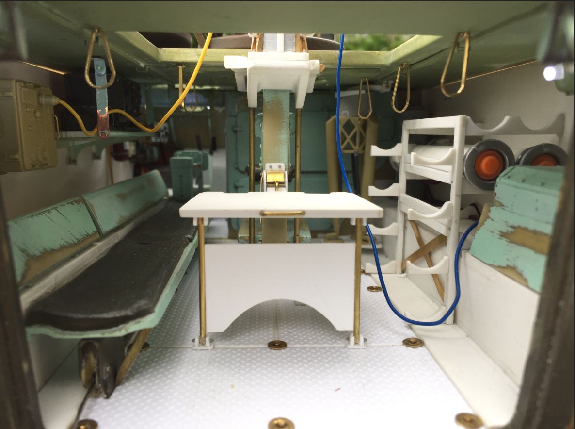 A LED had been inserted in the very visible interior light at the back, drilled through the Verlinden resin part . I was forced to mount it on the wall instead of the roof because the roof is removable and i do not want any wiring attached to it.