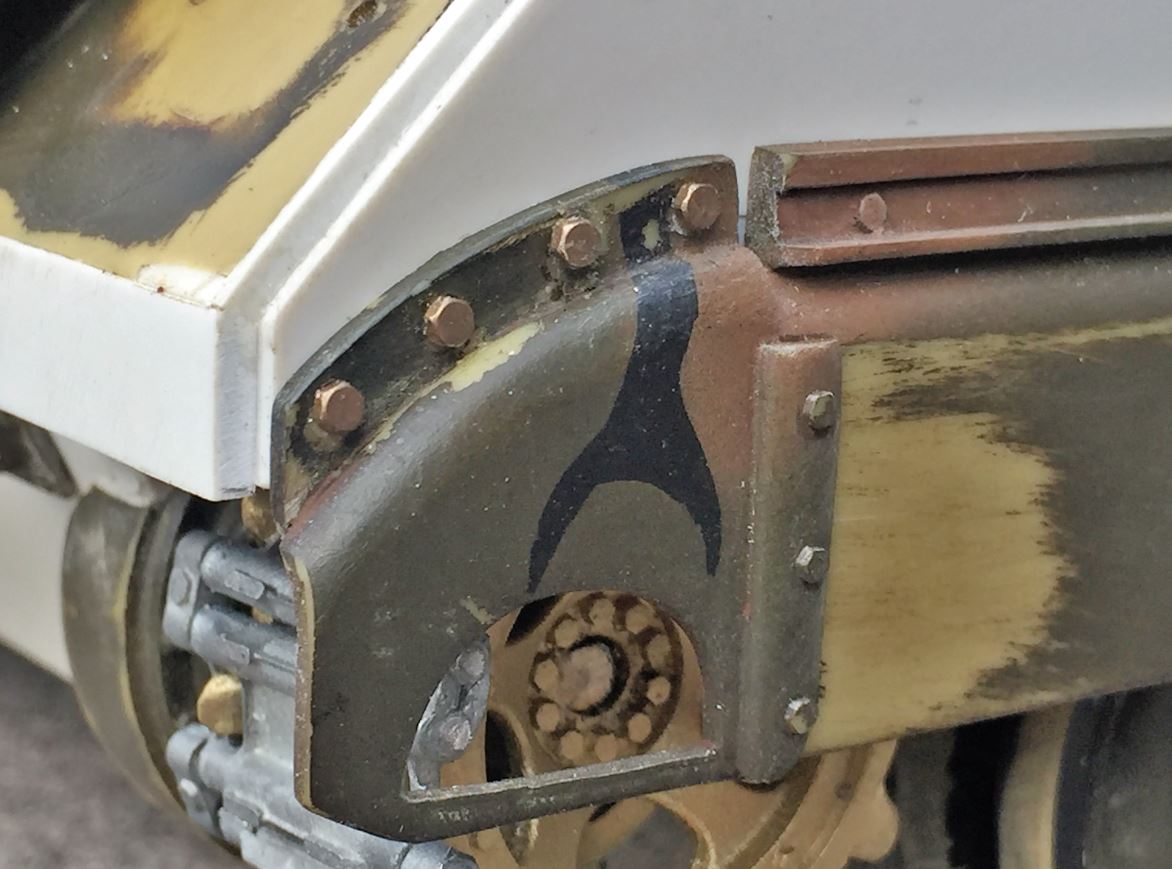 The molded in bolts on both front and back have been replaced by real brass bolts that can be unscrewed to remove the side skirts, like the real thing. No need to design anything fancy here. It looks good too.