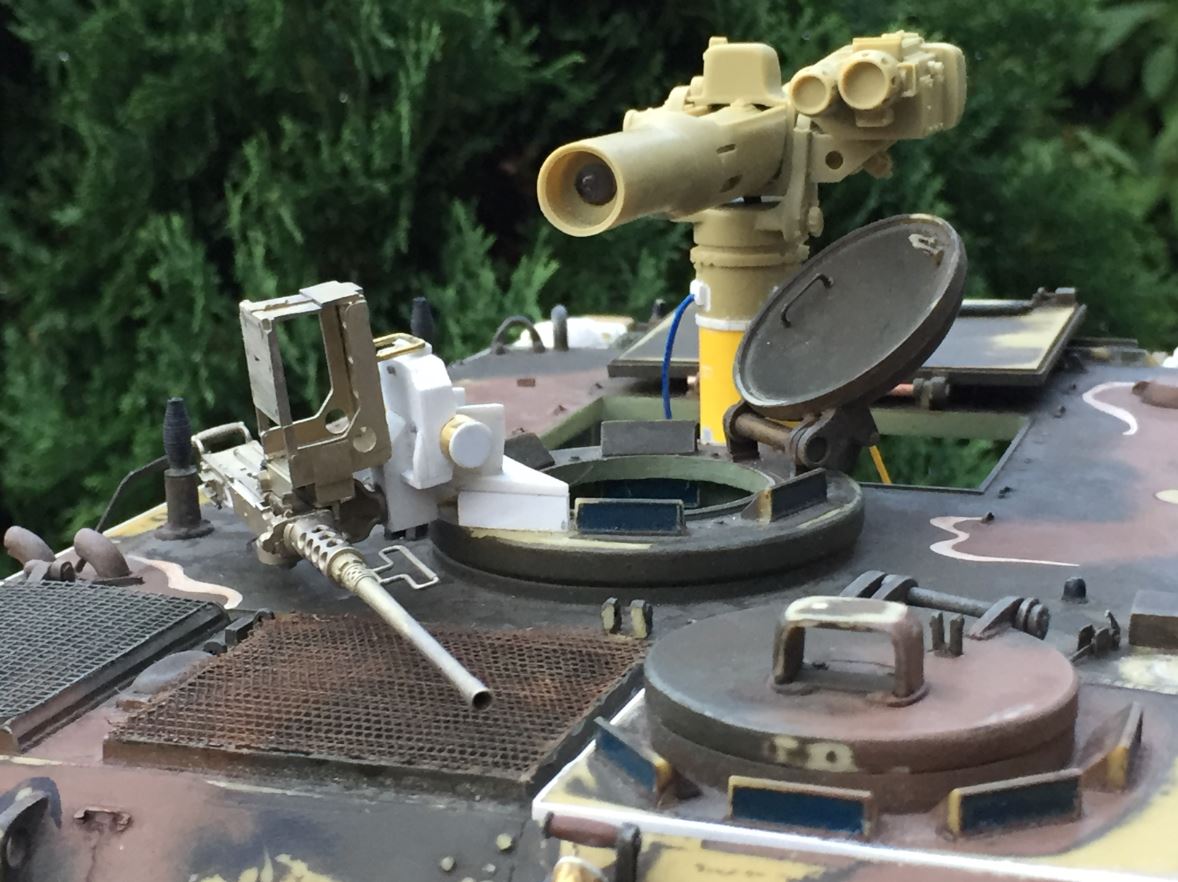 The regular triangular MG mount on the M-113 cupola has been removed on later TOW launching version because it was in the way of the TOW gunners. It was replaced by a mount with a folding mechanism, allowing the commander to lower the M2 .50 Cal MG on the side. See lower left picture below.