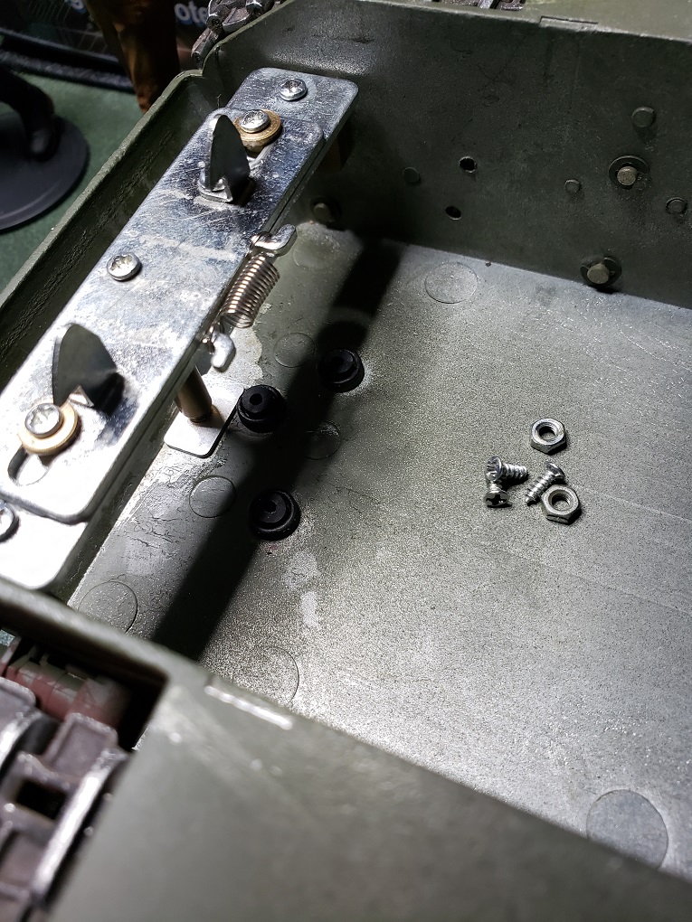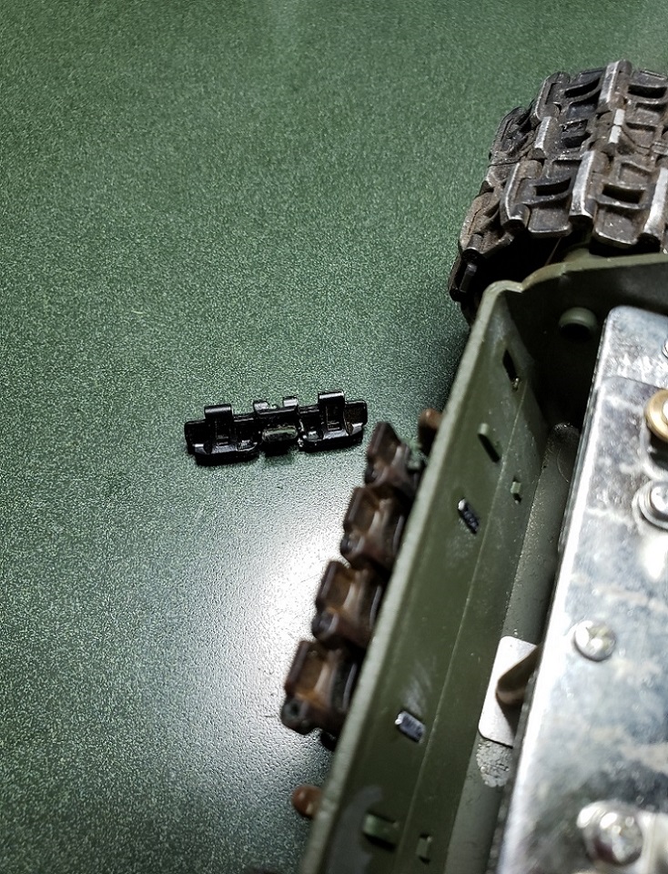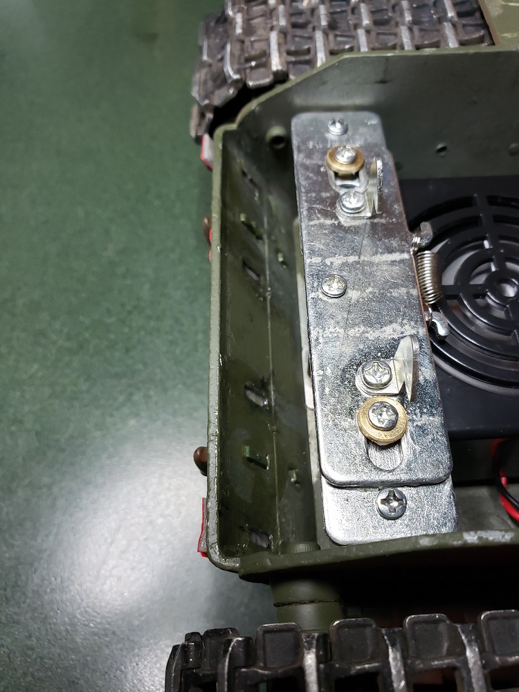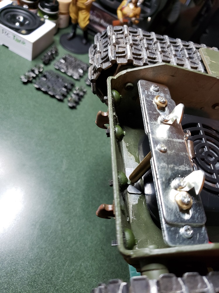 Good morning! A few more hours worth of progress on this tank. I ran into an issue which has slowed me down. The new speaker box is preventing a standard NiMh battery from fitting in the lower without interfering with the hanging Smoker. The original Taigen speaker is small enough that it slides under the brace bar for the hull latch and allows enough space for a battery. Maxx is getting one of these Taigen Babes in tomorrow so we should be able to get a working size speaker box designed and printed. The stock speaker is not bad but the visaton type is noticeably better. Metal track links for lower hull mounted spares are on the way as well. Pics ( click to enlarge )