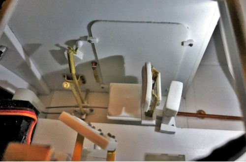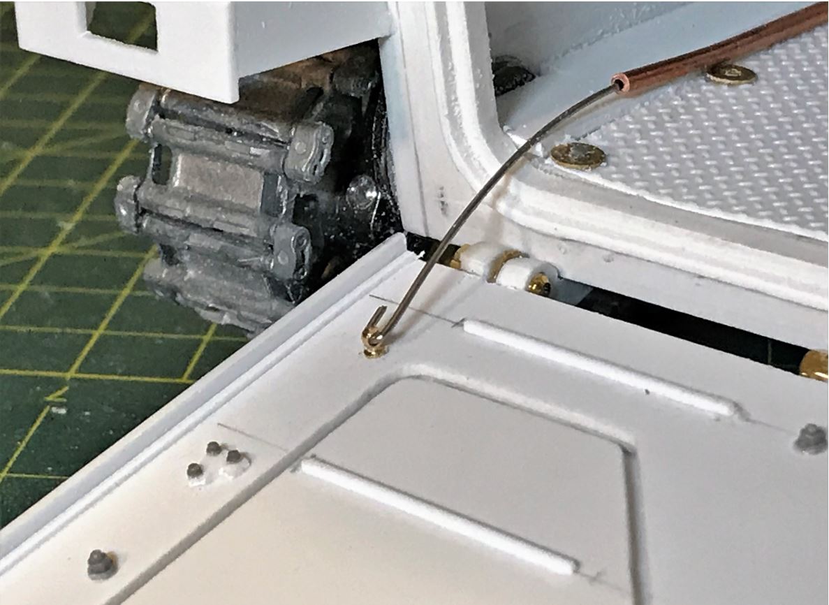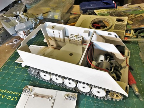 The ramp is opening using a push rod (actually a Heng Long receiver antenna) inside a brass tube traversing the crew compartment, all the way to a servo at the front the vehicle.