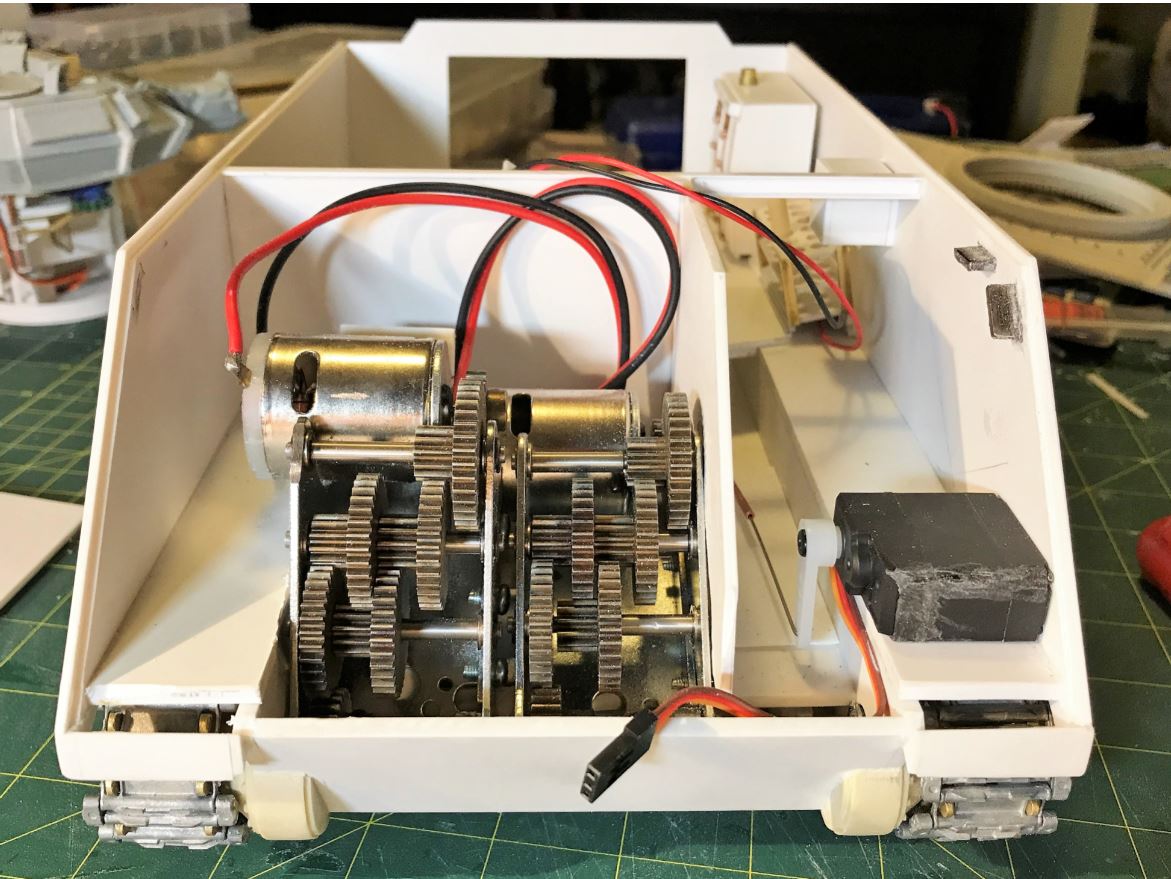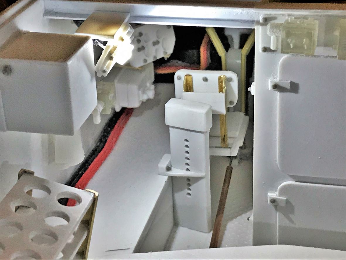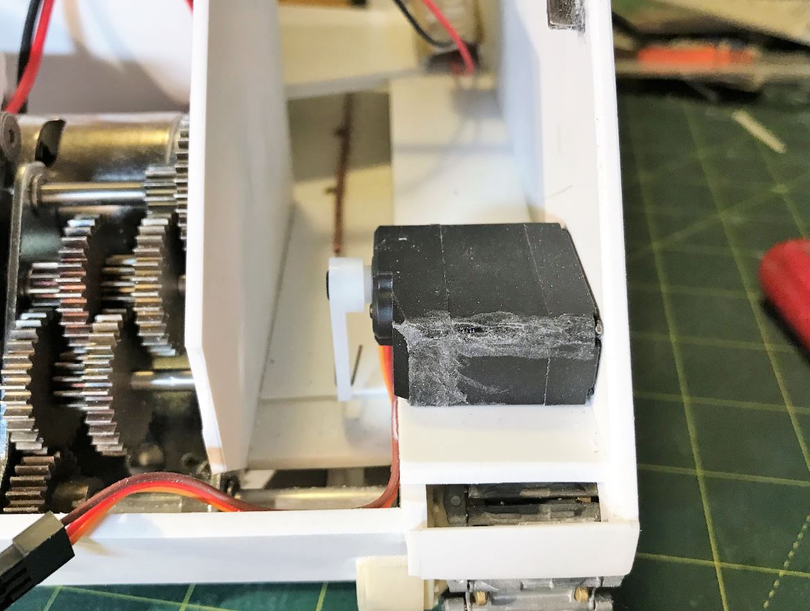 A medium size servo is installed at the very tip of the vehicle, in front of the driver position and with the push rod running under the driverès seat. It should not show much. I tried a micro servo earlier but it was too weak and did not have enough arm length to fully open the ramp.