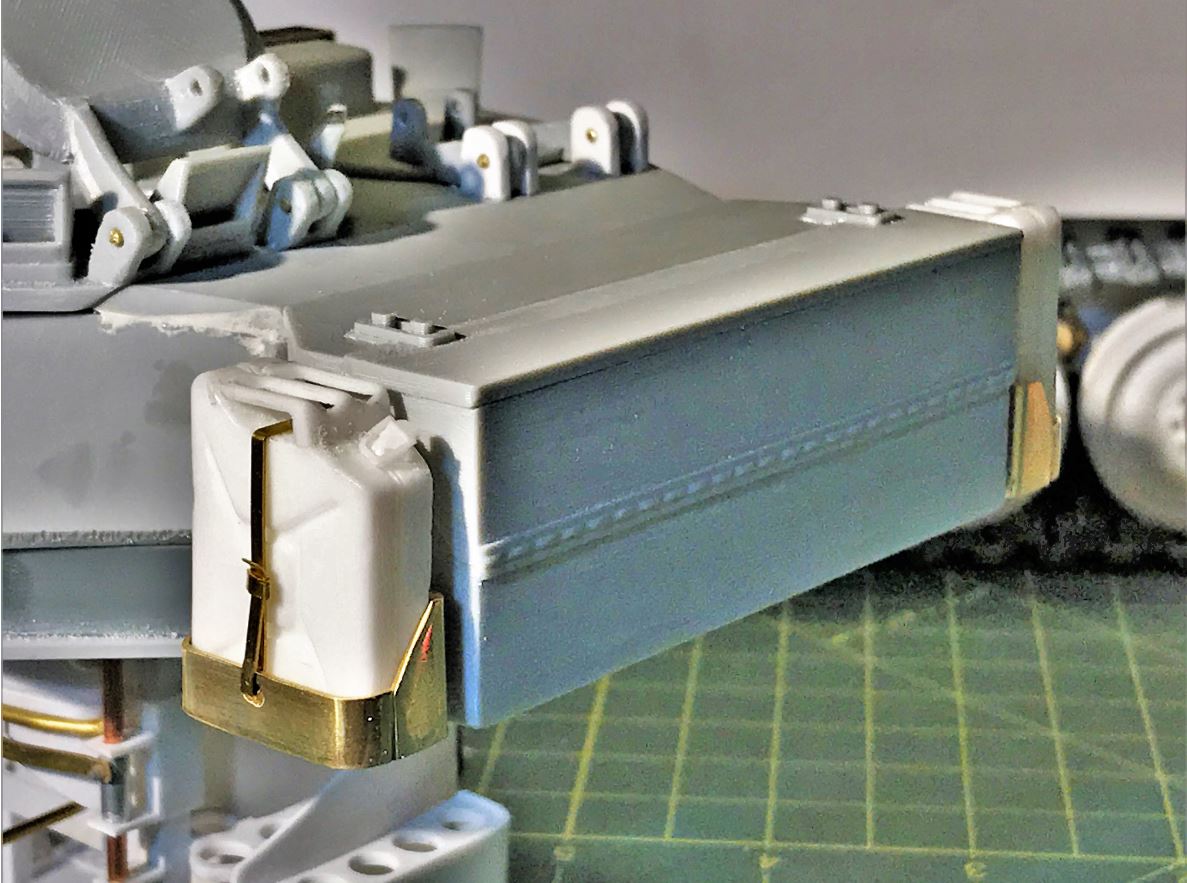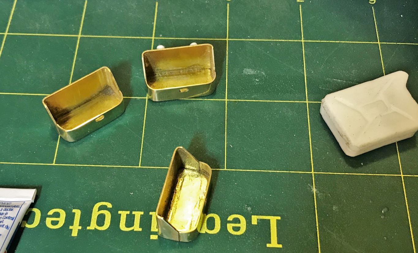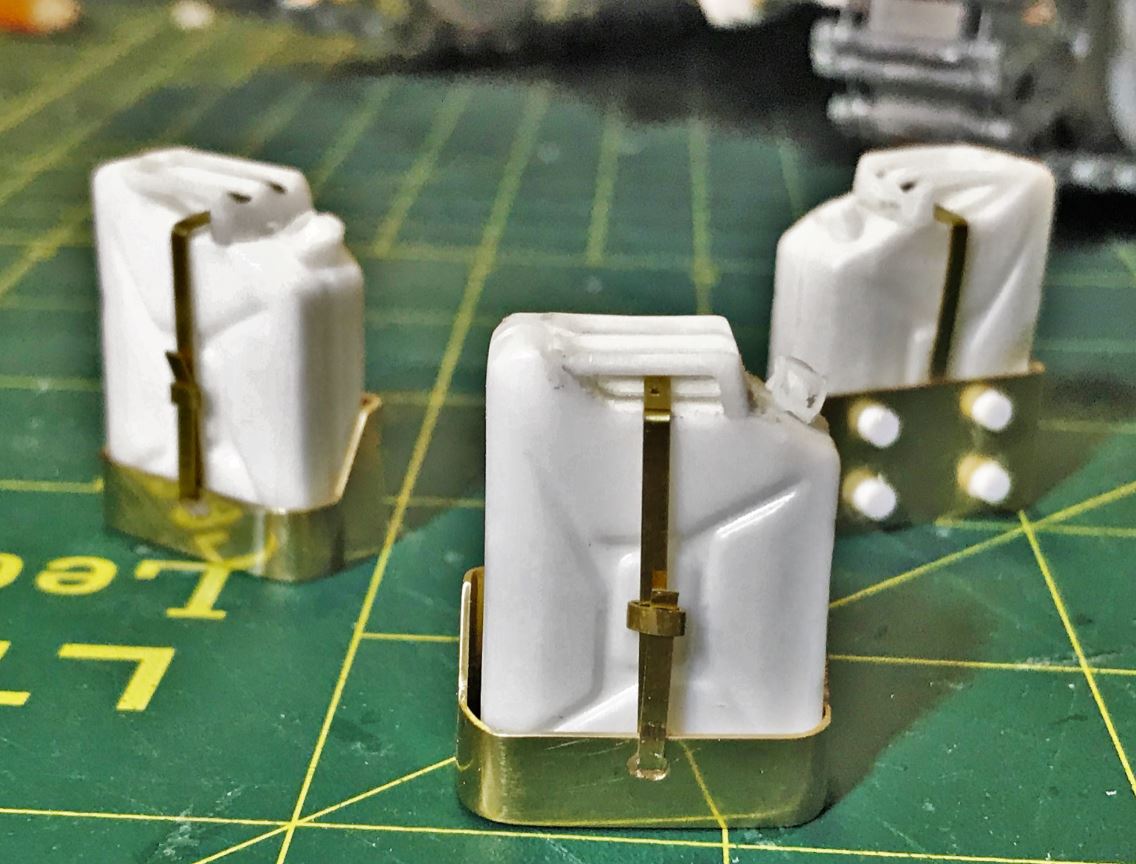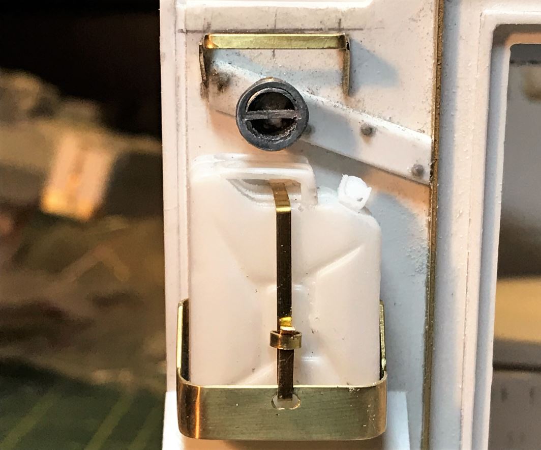 The jerrycan holders were built in brass, designed to fit SOL model jerrycans.