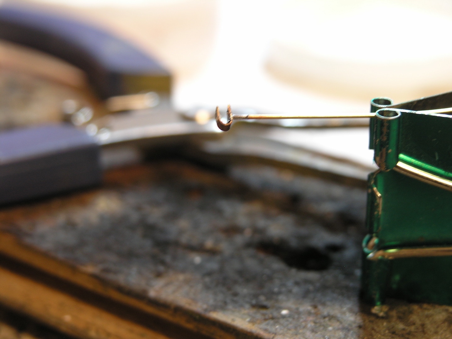 Using a small modeling file flatten the area to be drilled then using a centre punch tap a hollow into the rod and using your pin vice drill the hole.