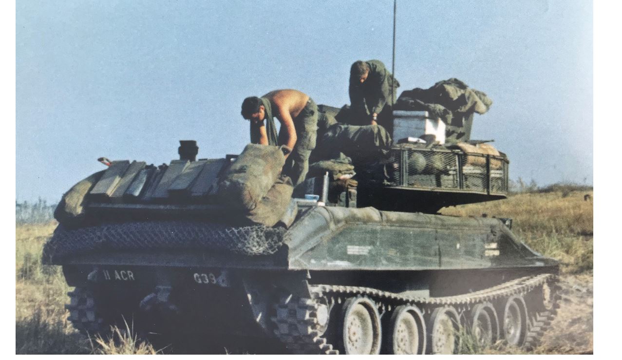 Same vehicle from the rear, you can't recognize that it is actually a Sheridan under all that stowage and gear. Notice the high number of smoke grenades at the ready, useful in case of ambush.