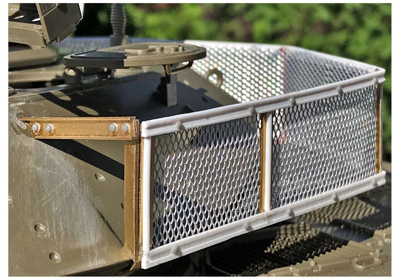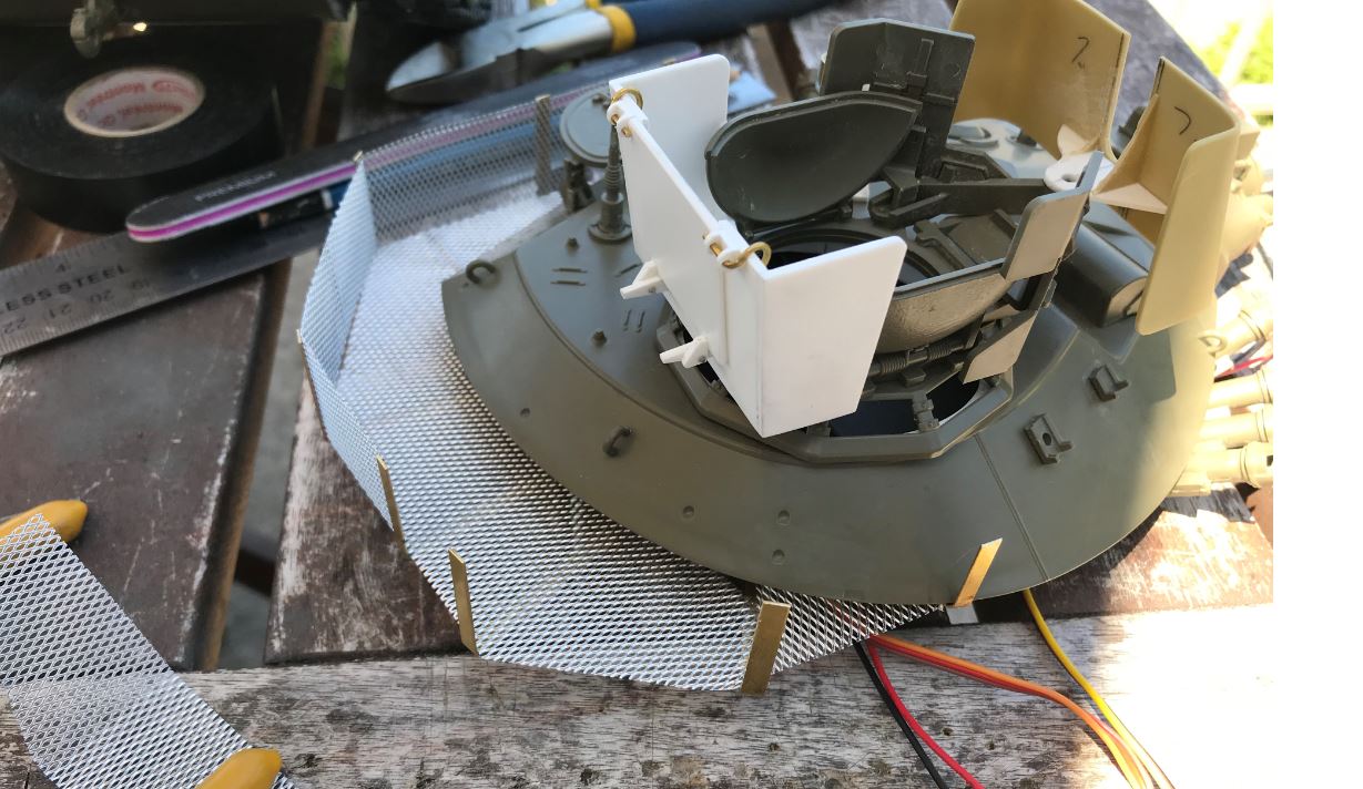 The main issue is that the Sheridan turret is not really round, its asymmetrical, and so is the basket. The Tamiya turret opens horizontally in 2 halves right in the middle, and the basket has touch points on both upper and lower turret, complicating things and forcing some compromises. Also, there is not a single flat surface of the turret sides, complicating things when you are building the basket out of nothing and the builder need to define some orientation and anchor points. After a lot of study, I started the basket with a "best effort" mindset, as if I was a mechanic with a blowtorch in a field unit and tasked to create a large basket for the unit tanks. None will be exactly the same. Before cutting specious grill material, I would recommend the creation of a template in order to determine a shape that seems to fit key critical points, such as the basket starting points on both sides, height of the support in the back, height of the basket itself, but most importantly the locations of the basket corners and supports. None are obvious but its important that it looks right. Study of 1/35 PE basket kits on the market led to more confusion than help. One that look about right is from FC-Model Trend. Here, the first 3 supports are glued to the back bottom after a tentative shape is created.