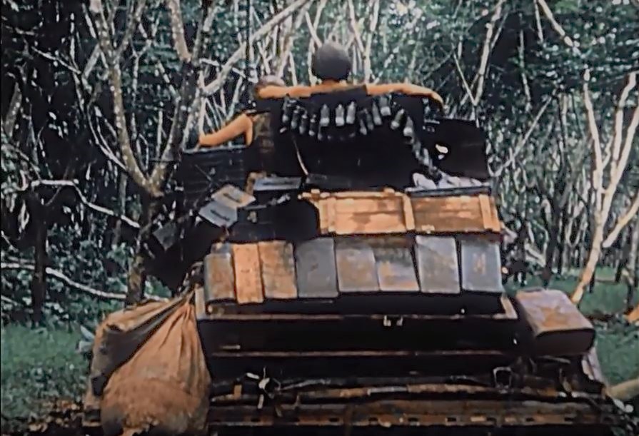 A rare view of a vehicle in action where the crew retained the original positioning of the ammo boxes on the turret sides, and everything still pretty much intact. It must not have been in country for a long time.