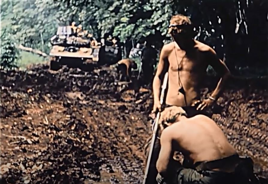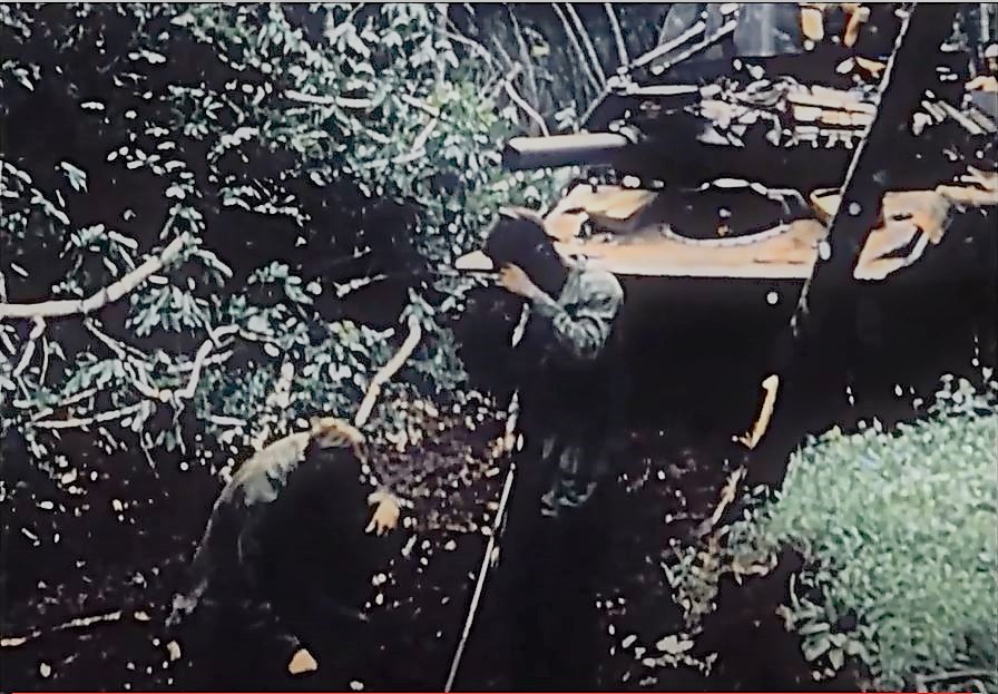 More open terrain but mines are everywhere. The US operation in Cambodia occurred in the extremely hot and humid summer weather, crews are mosly bare chest, with or without flak jackets.
