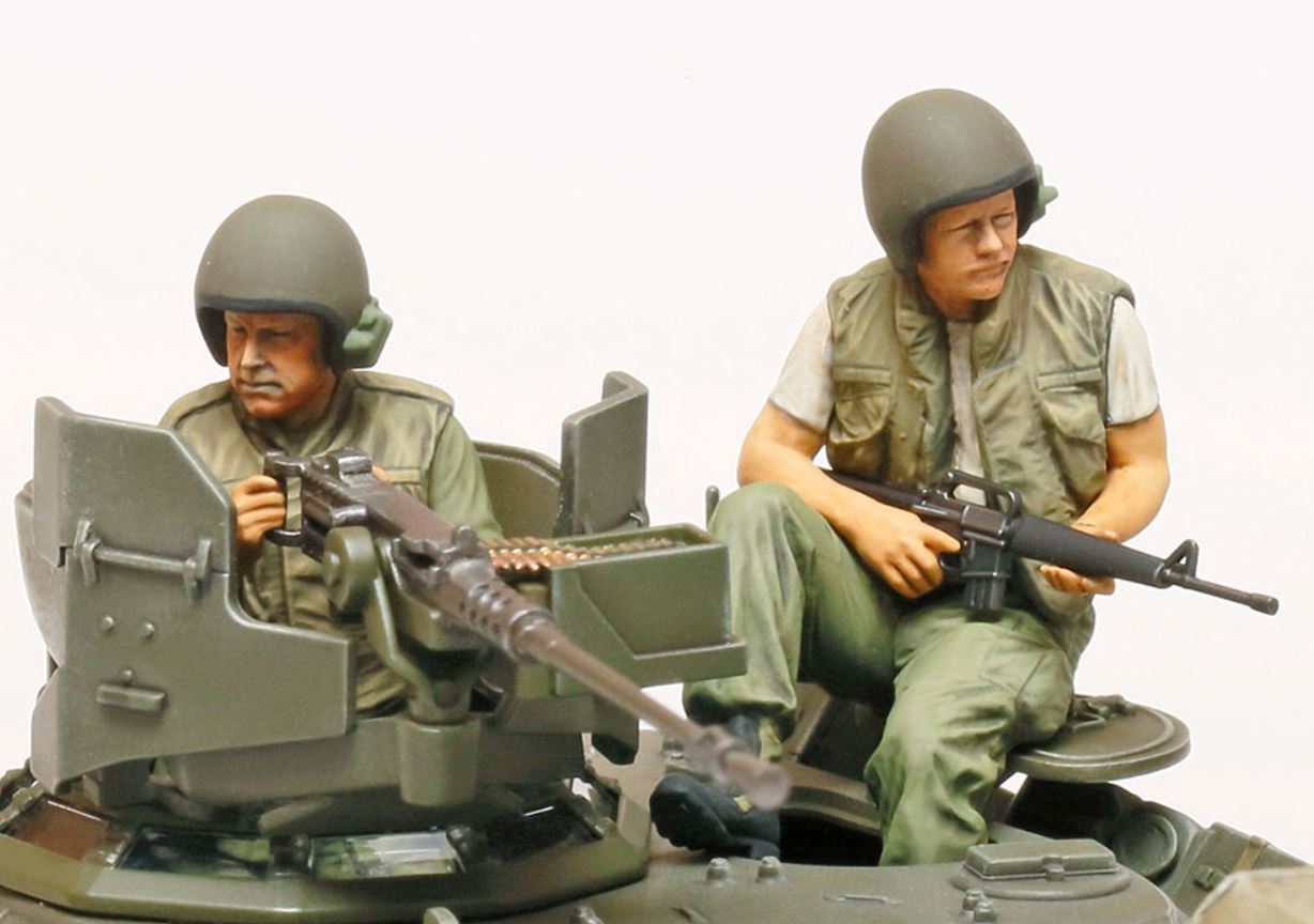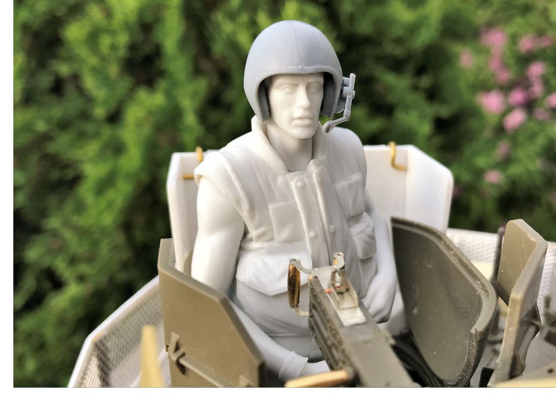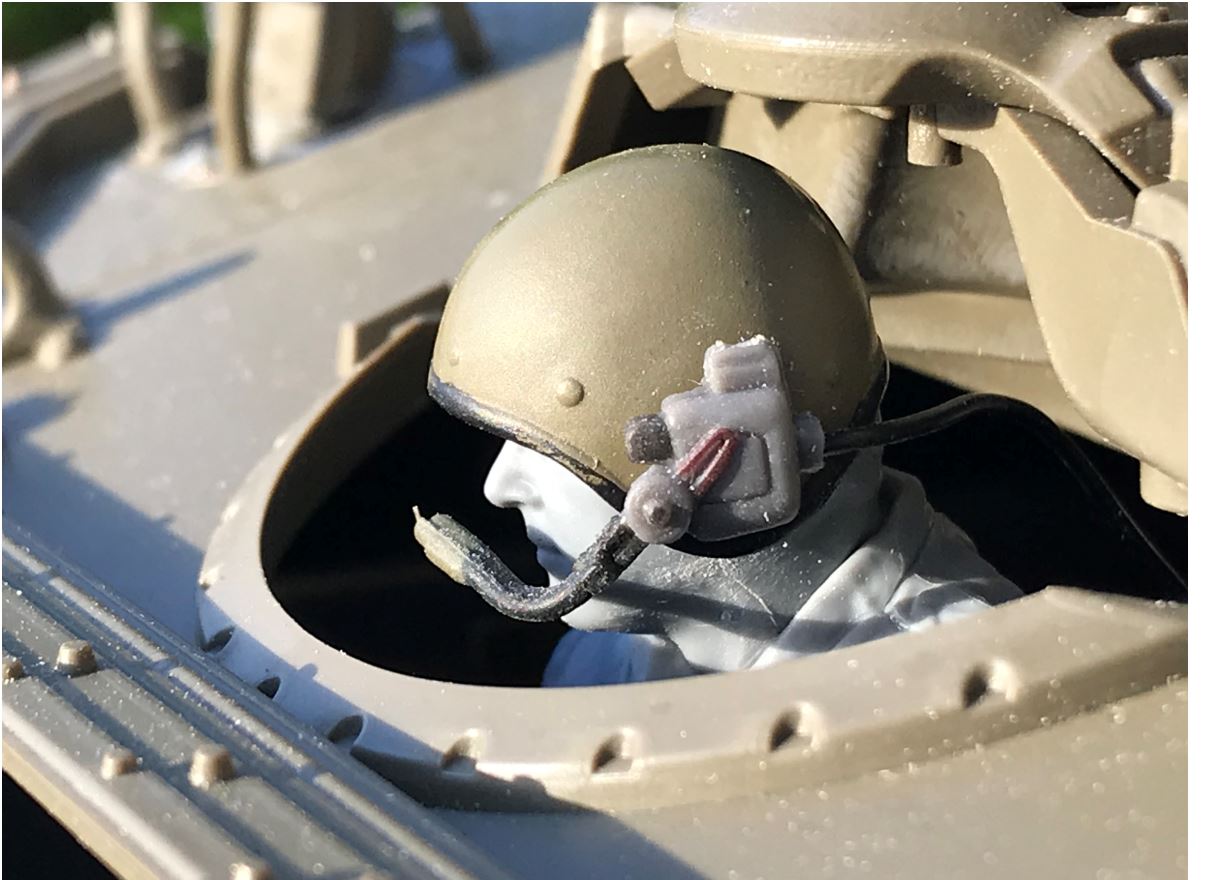 He is the same figure as my M113 ACAV commander, but I gave him the available tank helmet. There is almost nothing to do except trimming the hair and ears a bit to put on the helmet. He is highly visible on his cupola and a lot more interesting than the Tamiya figure.