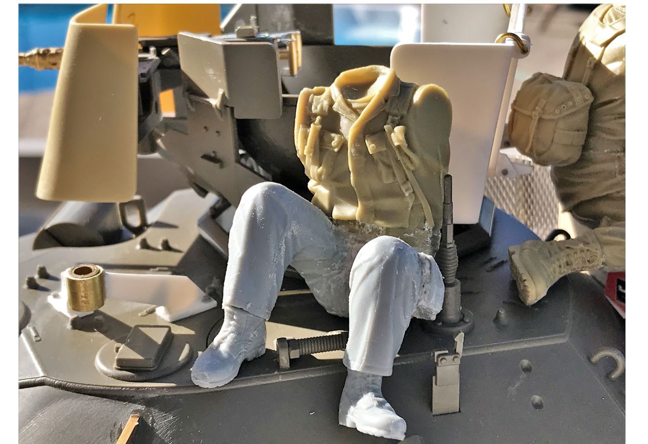 But real estate on the Sheridan to sit on is rare and I needed a figure that can sit on top of boxes on the turret basket. I therefore decided to use the Dremel to remove the resin base and carve out the legs, in order to have only the figure remaining, and see what i end up with.