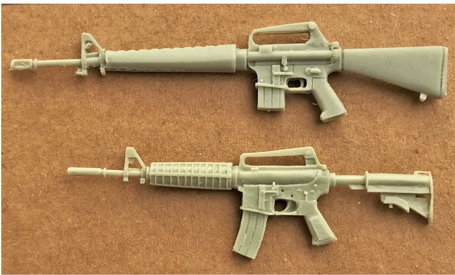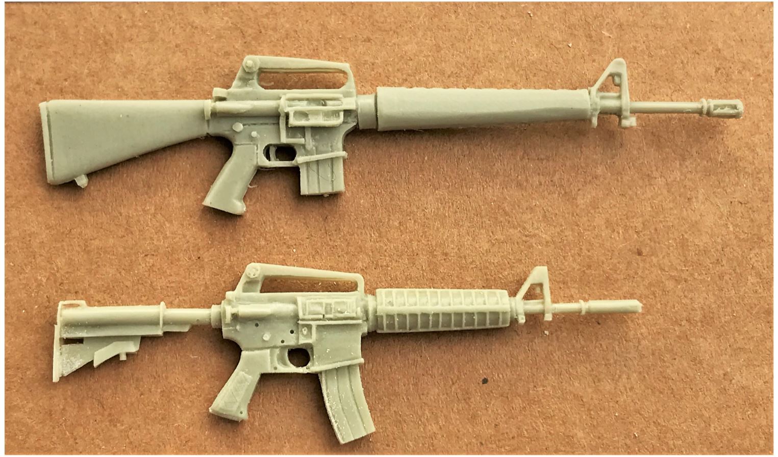 The CAR-15 commando rifle discussed earlier is shown here next to a Reedees Miniatures M-16A1. Both are excellent.
