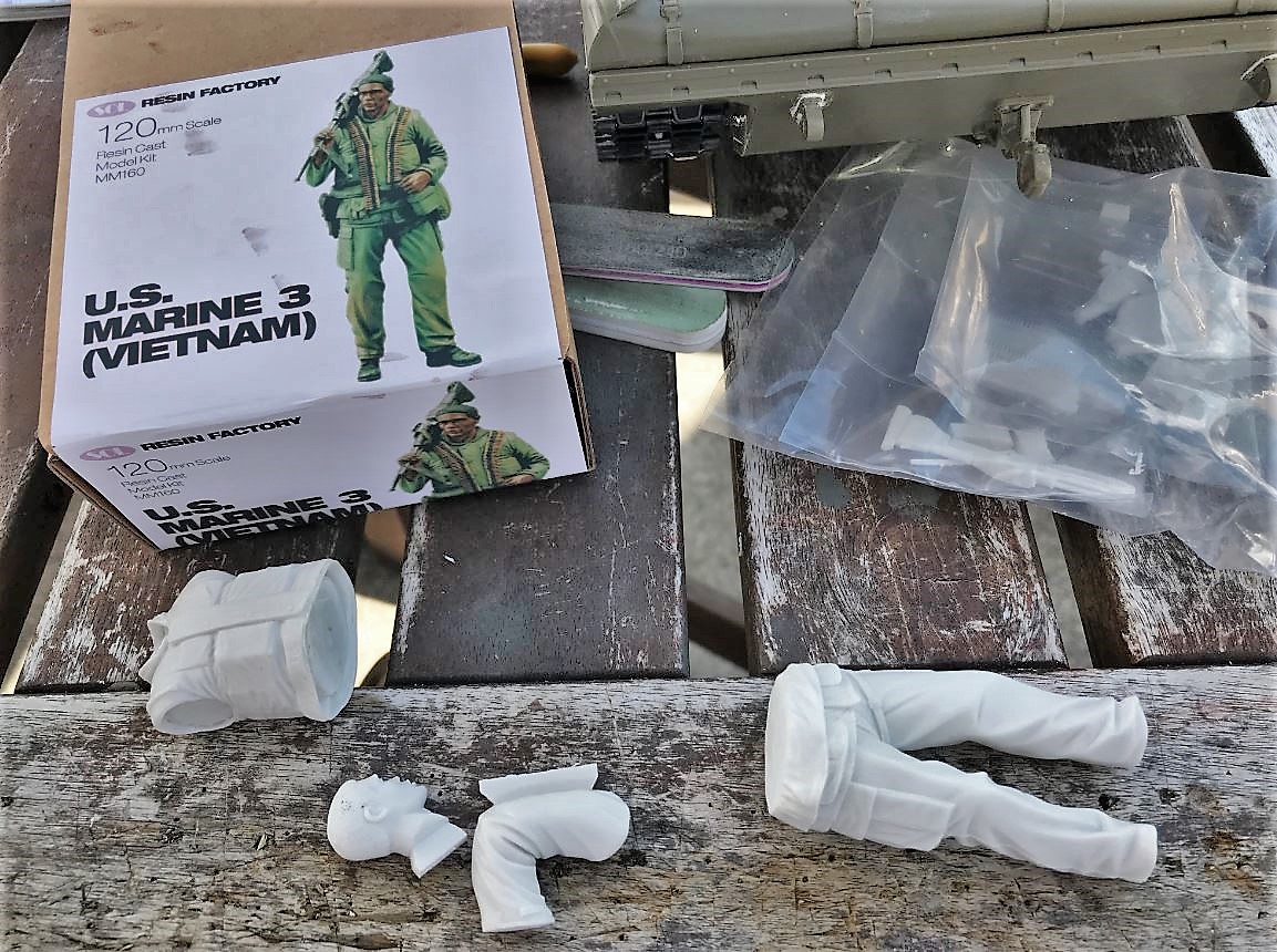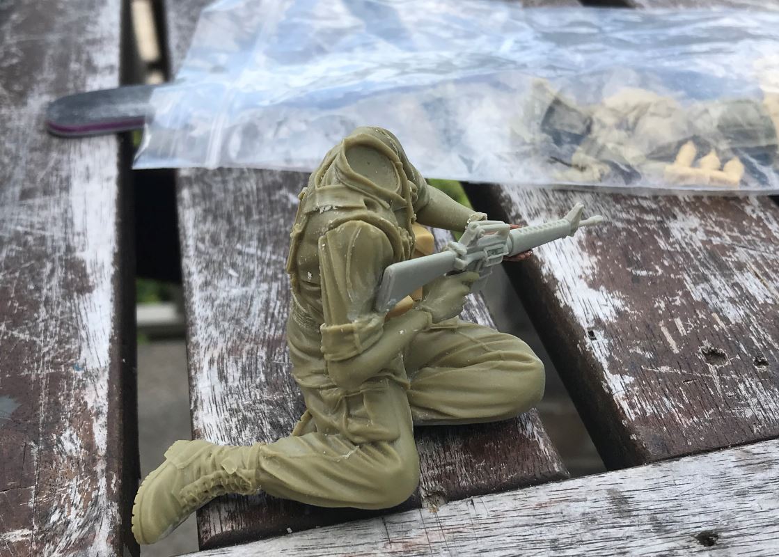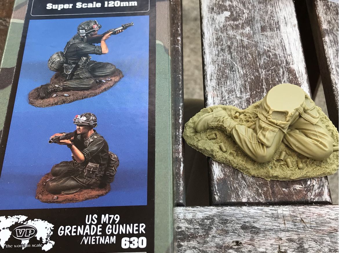 The M16 rifleman. This is the Verlinden M79 gunner that I use many times as a base kit for my Vietnam figure. It has a bended torso that is perfect for sitting figure. He comes with nice Vietnam gears (just the helmet is worth the price) but the legs are bad. They come molded in its base. And the pose is not obvious. I still wonder if it is technically possible to sit in such position without dislocating a hip or a knee.