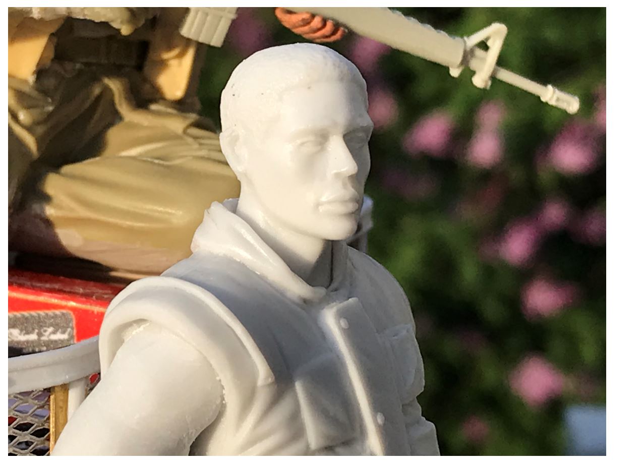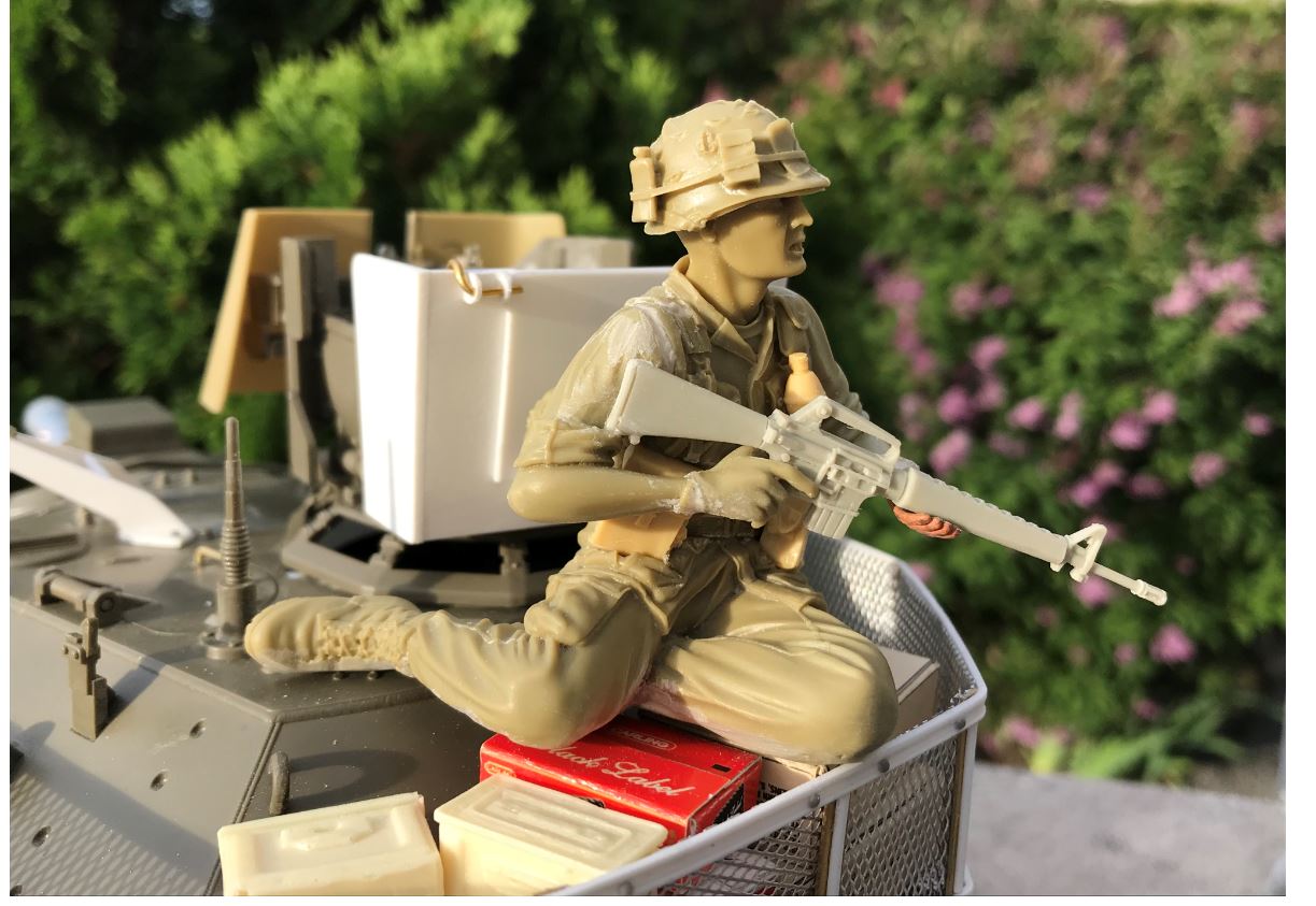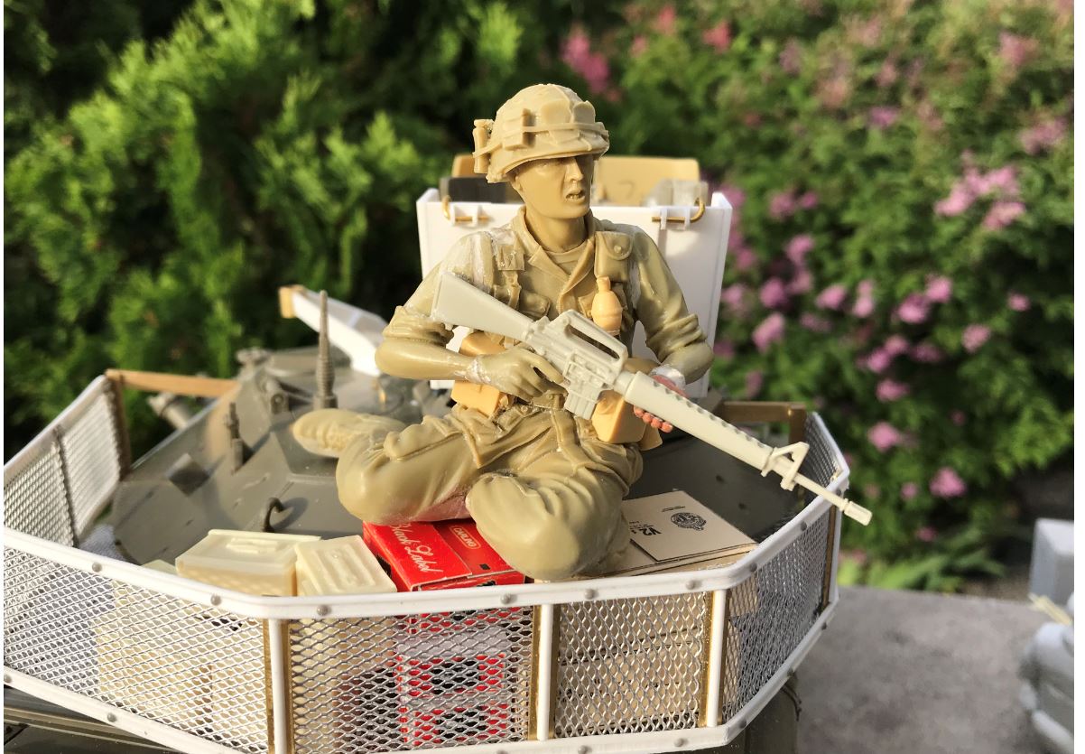 The new commander is the SOL Model Marine 1 . This is a beautiful figure, tall with a well sculpted expressive face, armed with an M-14. Most importantly, he is bare chest under a flak jacket, this is the look I wanted for a Sheridan commander in Vietnam. Some critics will say that I use 120mm figures with 1/16 and that it should not be. Keep in mind that the general American male population probably has a height ranging from 5 feet 4 to 6 feet 4, with a lot of differences in the muscular build. It is actually un-realistic to always show figures that are all exactly 6 feet tall with same body build.