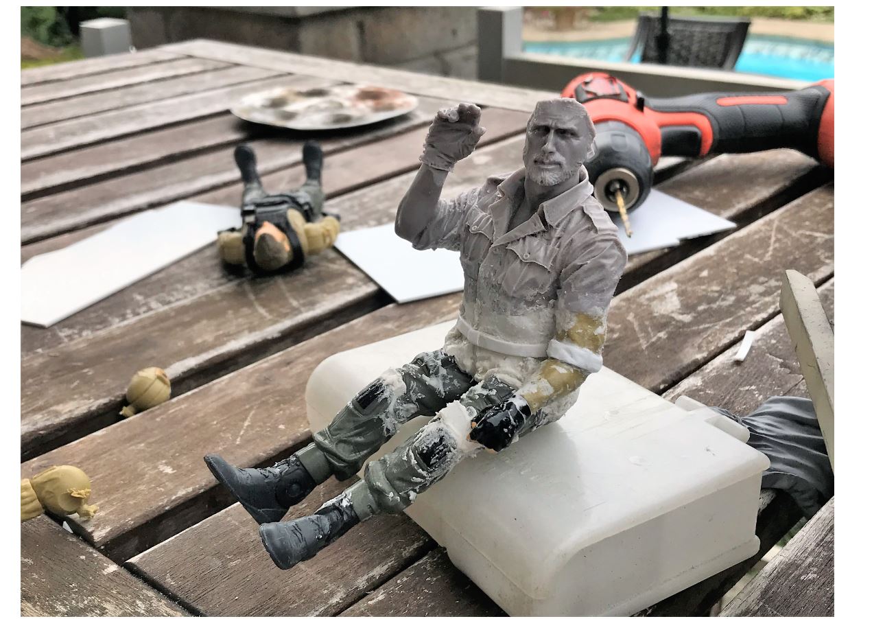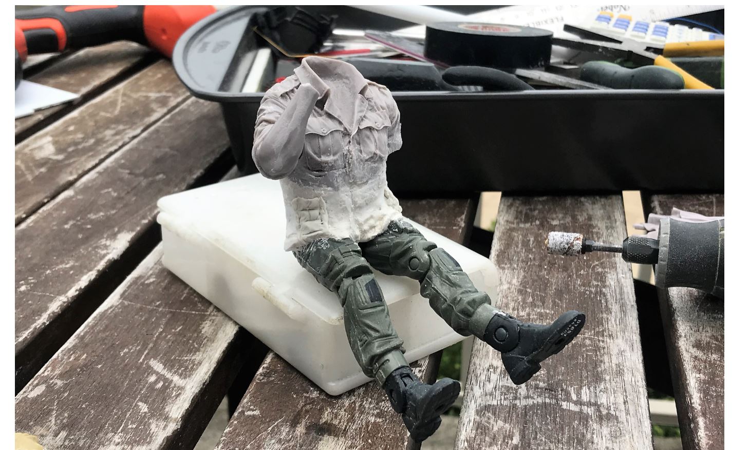 For the missing left arm, the action figure arm is cut and reused, bridged to the resin bust. The folded sleeves are repro in plasticard.