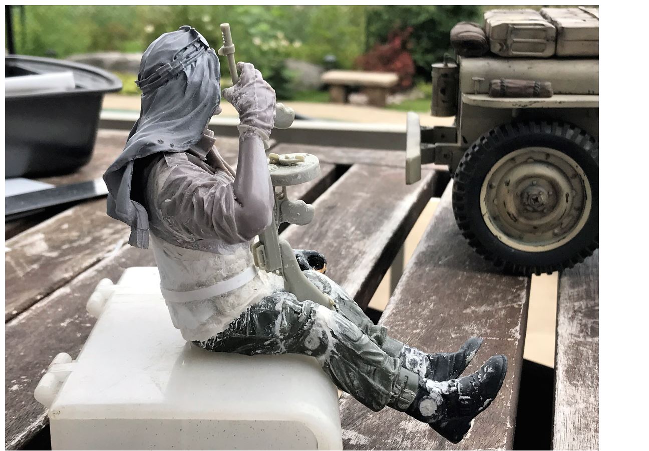 For the right arm in the air, the option was to show him either saluting or holding a weapon. The body is too far from the machine gun to show him holding the M2. I therefore decided to arm him with a Reedees Miniature 1/9 scale Thompson machine gun. The reliable "Tommy Guns" found their way into the LRDG. The version shown here is the M1928 with vertical front grip and the high capacity drum magazine that were surely prized by the SAS. Its 1/9 but there is not real alternatives.