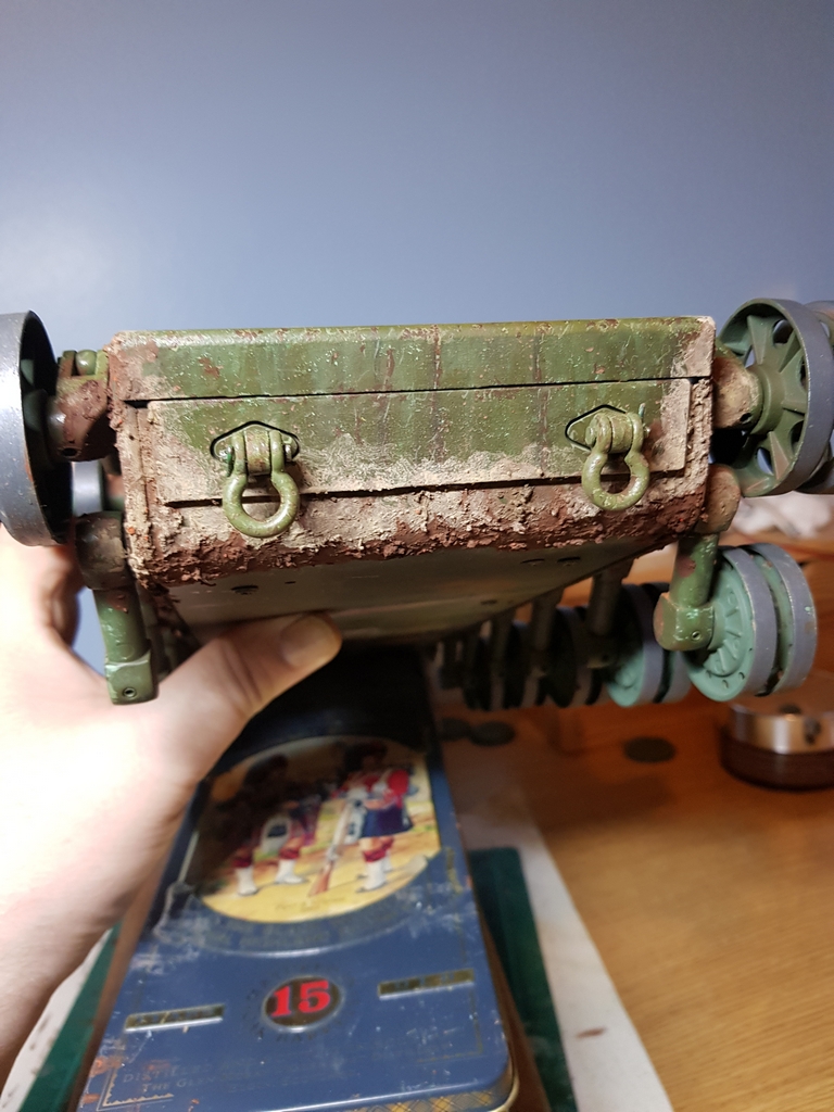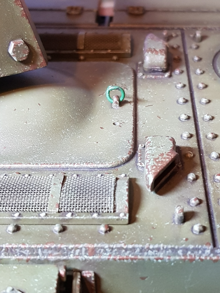 Next was going round the light green scratches with a brown gun metal mix and painting the machine guns black . I also went over the scratches now with a oil paint rust colour wash , but very light as I don't want much rust on this tank , lots of scratches as its just been hit with over 100 rounds but not old enough to be really rusted.