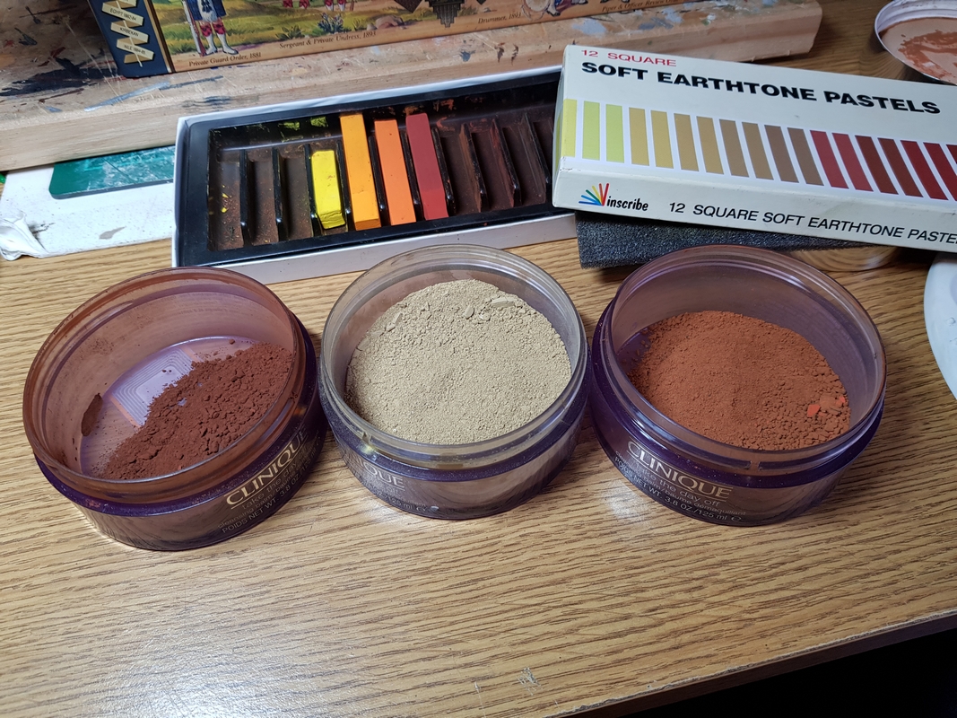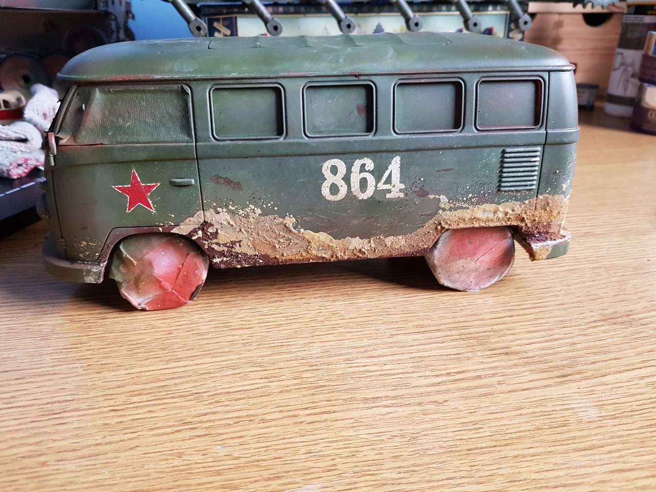 Now I want to try mud effect , so I crushed most of the earth colour soft pastels in 3 different batches , to make 3 tones of mud and keeping the more rust colour pastels to make rust pigment , trying everything out first on my test VW bus , Guinea Pig Wagon. I mixed the pigments with half water and pva glue and some fine real garden dirt , mixed together and dab on. I don't want it to look overly muddy, like winter , more spring , summer time and its just gone through some muddy shower puddles , mostly drying out mud. It would be good to know if anybody has other methods and advise on how to do this better.