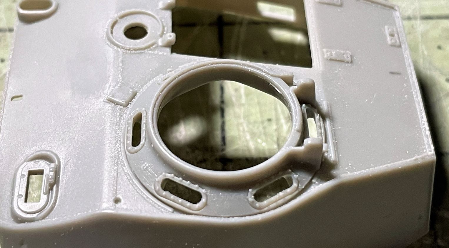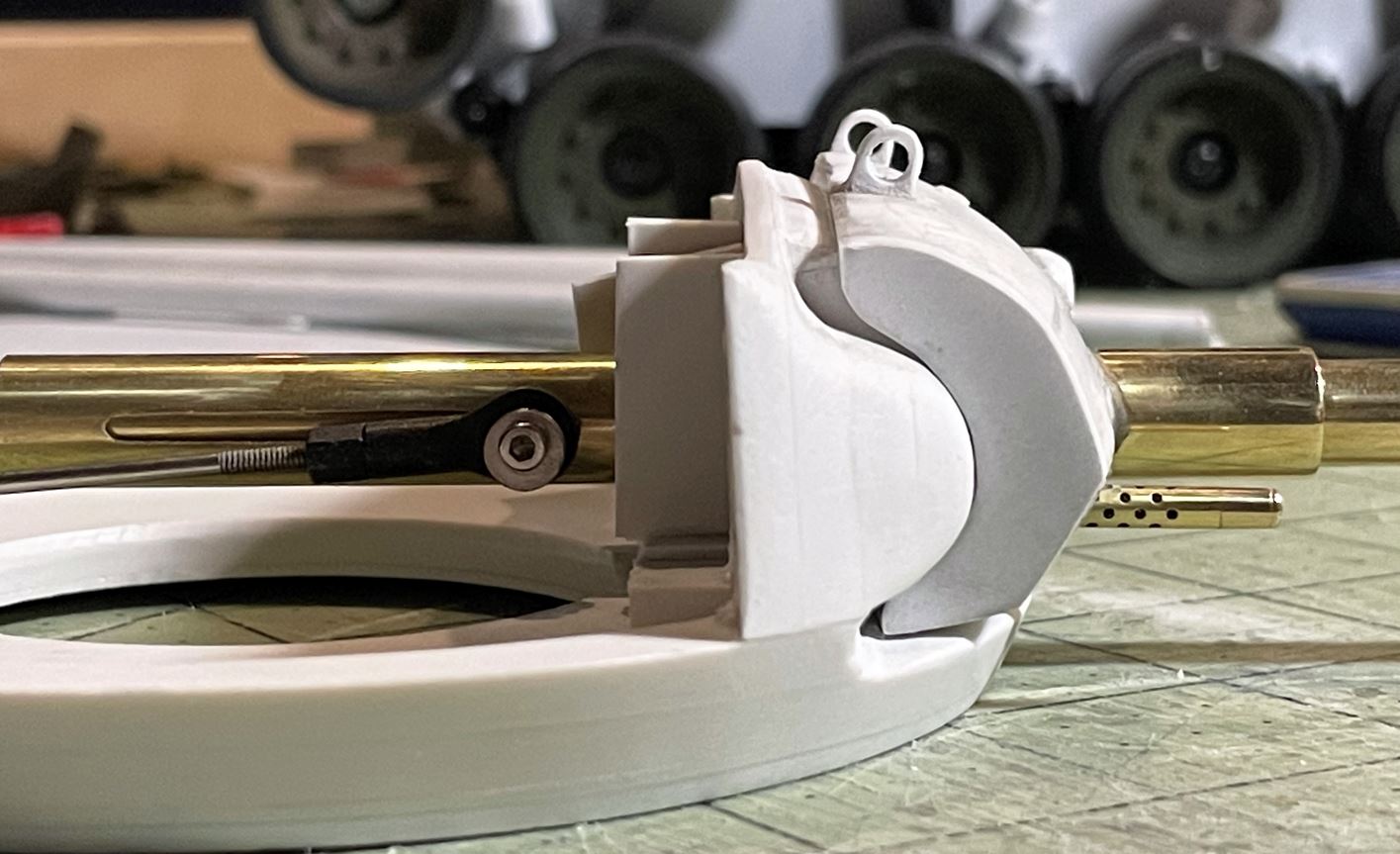 Then two hours later, the mantlet is in it definitive overall shape and ready for detailing. Test fitting with the turret mount show degrees of gun elevation consistent with the one seen on the 1/35 kit, not great but good.