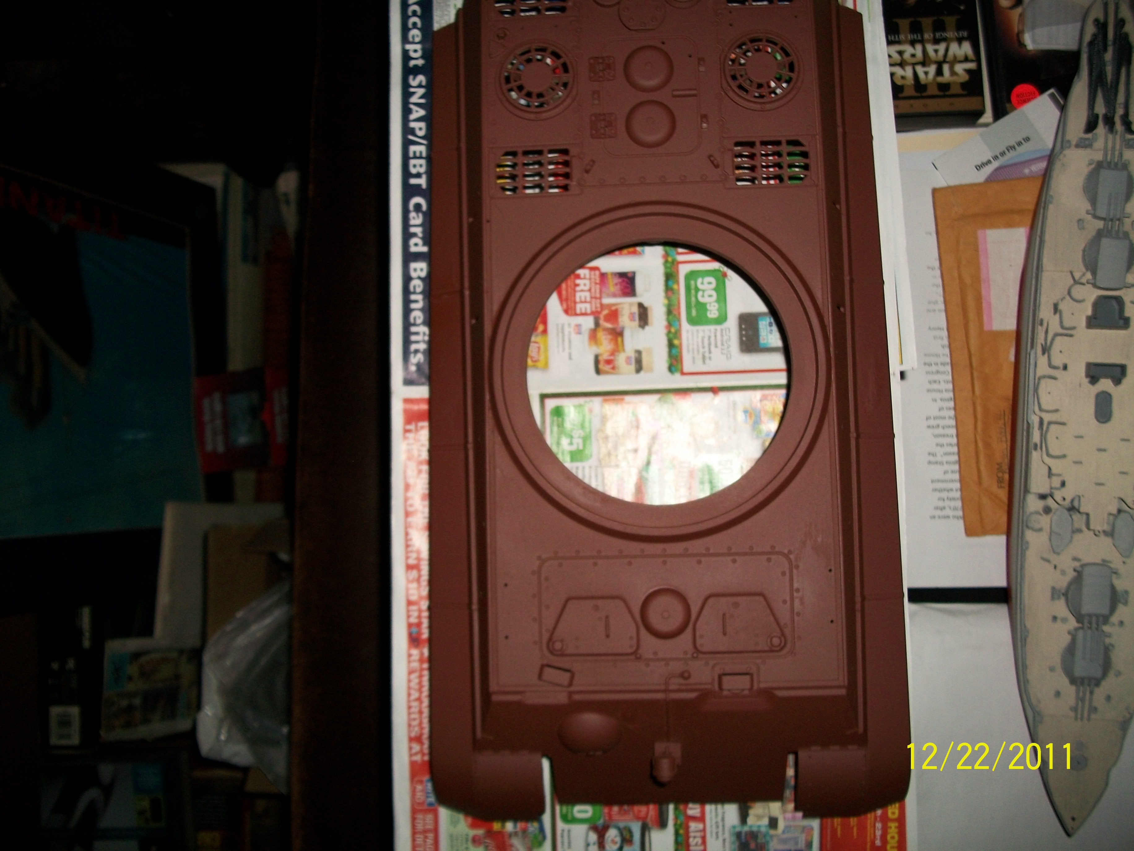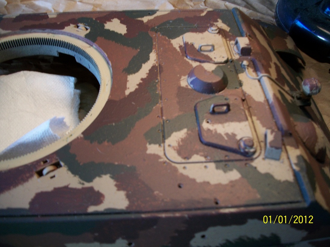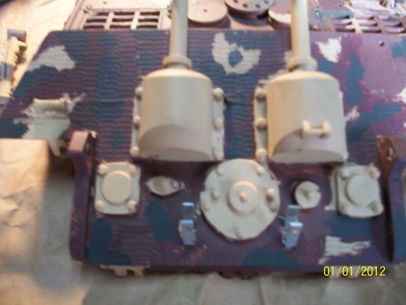 It has been sprayed with three coats applied with low PSI and a light mist,drying between coats was about an hour,and this morning I used the Hair dryer to make sure all is well. Here are a few pictures. Still much to do,but the main pattern and paintwork is sealed and completed.The Zimmerit film is clearly scene,the back plate has only the New mixture on it,which seems very Matte/Flat.