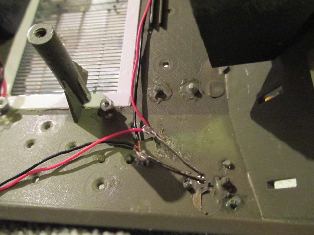 Thank you for the picture. I'll run out to Radio Shack and pick up a resistor of the 120ohm type and solder it into the hot cable that leads from the front lights to the rear lights. It is a well defined hot\ground pair leading from the bow to rear of the tank underneath the driver's side upper hull so I should be able to do this easily (easier than soldering in the LEDs at the rear of the tank were yesterday) I'll report on the results this evening.