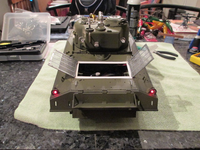 65th Day: Alpha, I was still working on it. I salvaged a mini 2 pin connector from a spare 1/24 Sherman M4A3(105mm) turret (oddly enough) and plugged it into the port Taigen provided and tested it on the rear LEDs. Success! For a brief moment, I had four flashing LEDs, front and back and when the tank was turned on, putting it into reverse lit up the rear tail lights. I shut everything down and soldered the connections and turned it back on to test.....No lights, front or back... Thinking that I had mistakenly switched the hot and ground, I unsoldered, resoldered and retried. Still, no lights, front or back. I tried another battery, still no lights. No knowing what else to do, I unsoldered the plug leads and cut the tail lights free from the miniboard. Tested and I had front lights again. I tested the mini port with an LED and it was still working as the 3mm LED lit up when the tank was in reverse. Not wanting to call it a night when I knew I was very close, I decided to try one more time. First, I cut the remaining wire from the miniboard even shorter, salvaged the 100ohm resistor and sealed the hot and ground off. Never know, might need them again one day. Then, I removed the mini 2 pin plug and cut the hot and ground shorter then soldered the wires on it to the hot and ground wires I had cut free from the miniboard and that were still soldered to the tail lights. Crossing my fingers, I plugged everything back in including the mini 2 pin in the Back Up Lamp port. I turned on the tank, flashing front lights and lit searchlight. Very Good. Then I started the tank with the Radio and hit reverse. YES!!!, I had tail lights! Taigen is an odd bird in this respect but now, I can go forward tomorrow with this nasty issue resolved. Here's wishing you luck with your electric build tonight, Alpha. Pics: