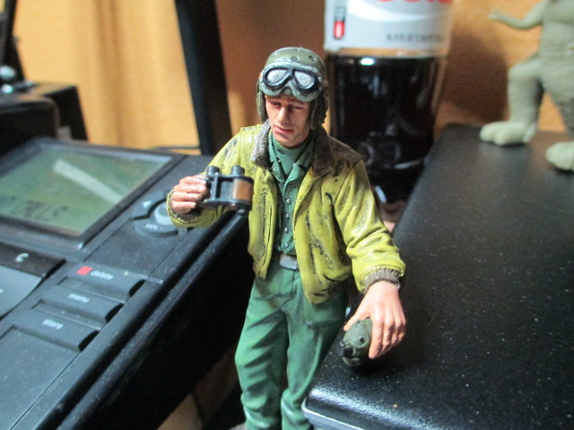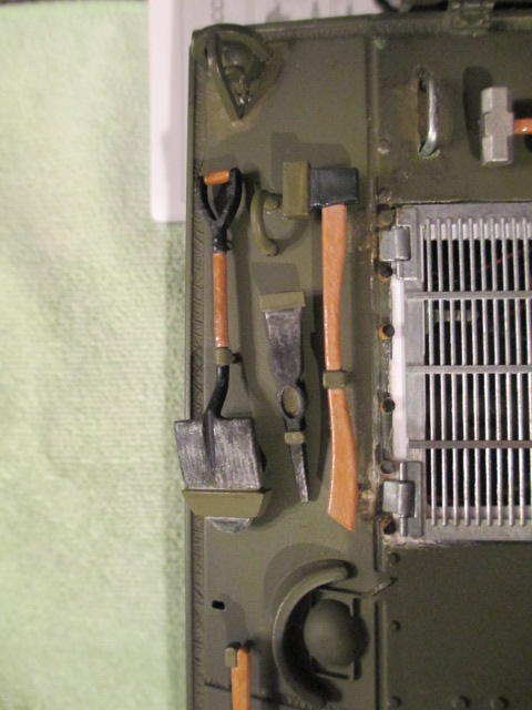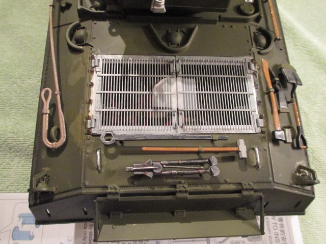 66th Day: Alpha, everyday is an adventure with a complex Build. I notice that your Sherman is looking grand in a fresh coat of O.D. tonight. ;o) Got a little research material for my next build in the mail today. It will prove useful and instructive reading. Sherman-wise, tonight was a cruise night compared to the tough going the last couple of days. I added the tools temporarily to see how the Engine Door rests would fit. I finally found a picture on the Sherman Minutia site to verify that HL did indeed place the tools correctly. I ground down flat the LED that forms the warning light for the gun firing in the Gun Shield Telescope aperture. I was going to make the neat armored slide cover for that scope then noticed that this part did not get added to the shield until late 1945. The LED in the scope mount is smooth and black looking now so I was pleased to get that much done to it. I finished up the night by doing some wire management under the rear deck. I also painted the tail light leads under there O.D. since they are exposed behind the rear bulkhead. I put a piece of clear acetate tape over them as well on each side to help hold them securely in place and add another layer of protection. The last thing I did was remove the black devil eyebrows my tank commander had been given by some tired Chinese fellow. I gave him a pair of regulation flat brown ones. A canteen for his empty hand was added until I can source a nice 1/16 map for him to be perusing. Pics: