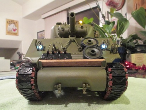 Heck Painless... you should send them pics of your SHERMAN.. it looks way better than the picture they have... the wheels are so sublime in that one.. but look great on yoursPainlessWolf wrote:73rd Day: Alpha, the dished road wheels were rare all the way up until the last months of the war. They were generally used for heavy weight tanks like the Jumbo and occasionally on the 105mm. They sometimes made their way onto the gun tanks as well. Look up pictures for 'Caballero', the tank we were given markings for by HL, (which is a 75mm tank, not a 105mm, by the way) and you will see one or two of the dished road wheels have been used for replacements on it. http://www.ww2incolor.com/art/M4A3+Sherman+Tank.html shows a complete set. Tonight, I tapped track together, adding two links per side to get proper slack in the set of MATO T74s I received. After that, I test ran it a bit and was exceedingly pleased. I love the way it skid turns even on rugs. This tank is way speedy and could benefit from a set of 4.1 black gears. It certainly is worth the extra expenditure so I'll see to that soon. Just for fun I put the tools on to see how they looked. You guys can be the judge. Pics: