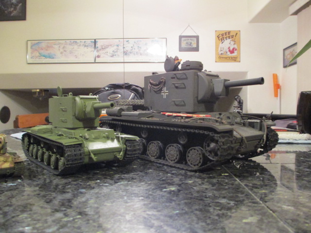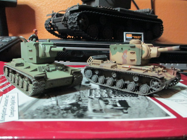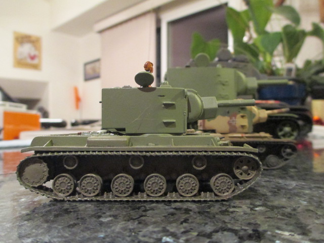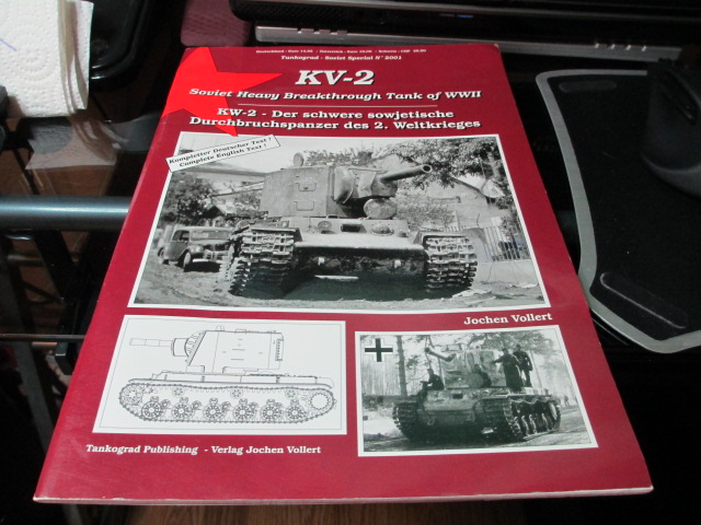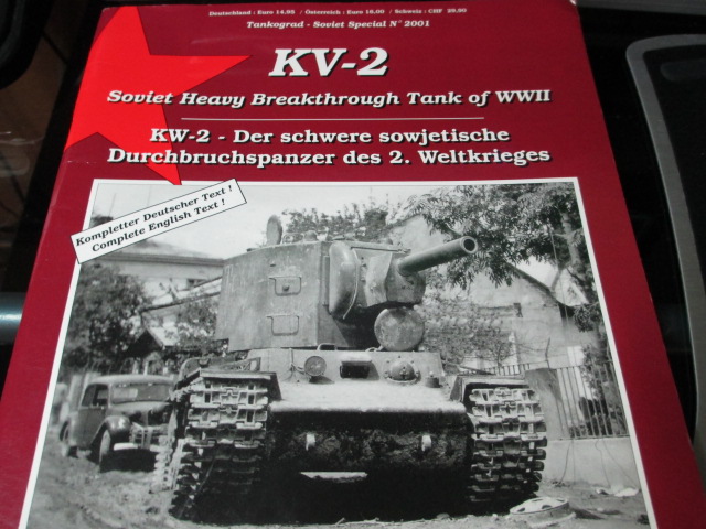 The final piece of the puzzle arrived in the mail today. 'KV-2 Soviet Heavy Breakthrough Tank of WWII' Thank you, Sassgrunt, you have an amazing Library of tank literature. ;o) I took a couple of pictures of all the paint schemes sitting together that I had assembled and\or painted. The 1/35 Protective Green version remains to be weathered but it can wait for another and better time.