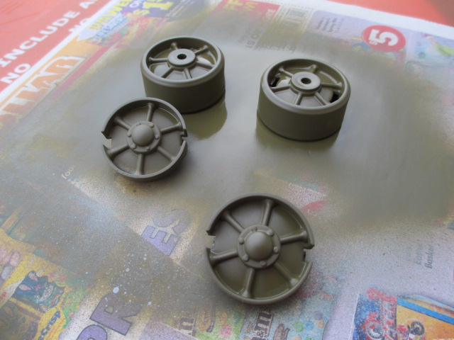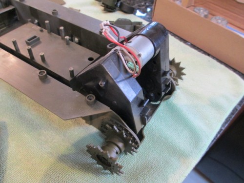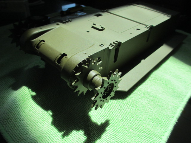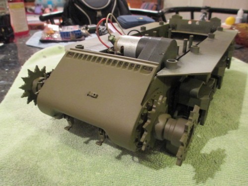 Took some time this evening to put the lower hull back together and get ready to mount the new 2.4GHz set in it. The idlers were primered and painted. The bogies and road wheels received a couple of dusting coats as well to help them blend in with the Model Master shade of OD. They were already much better looking than the set they replaced. Pictures: