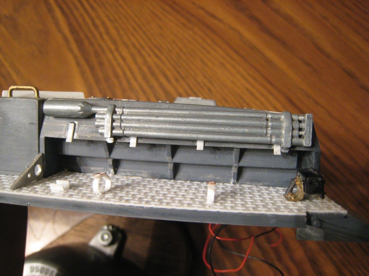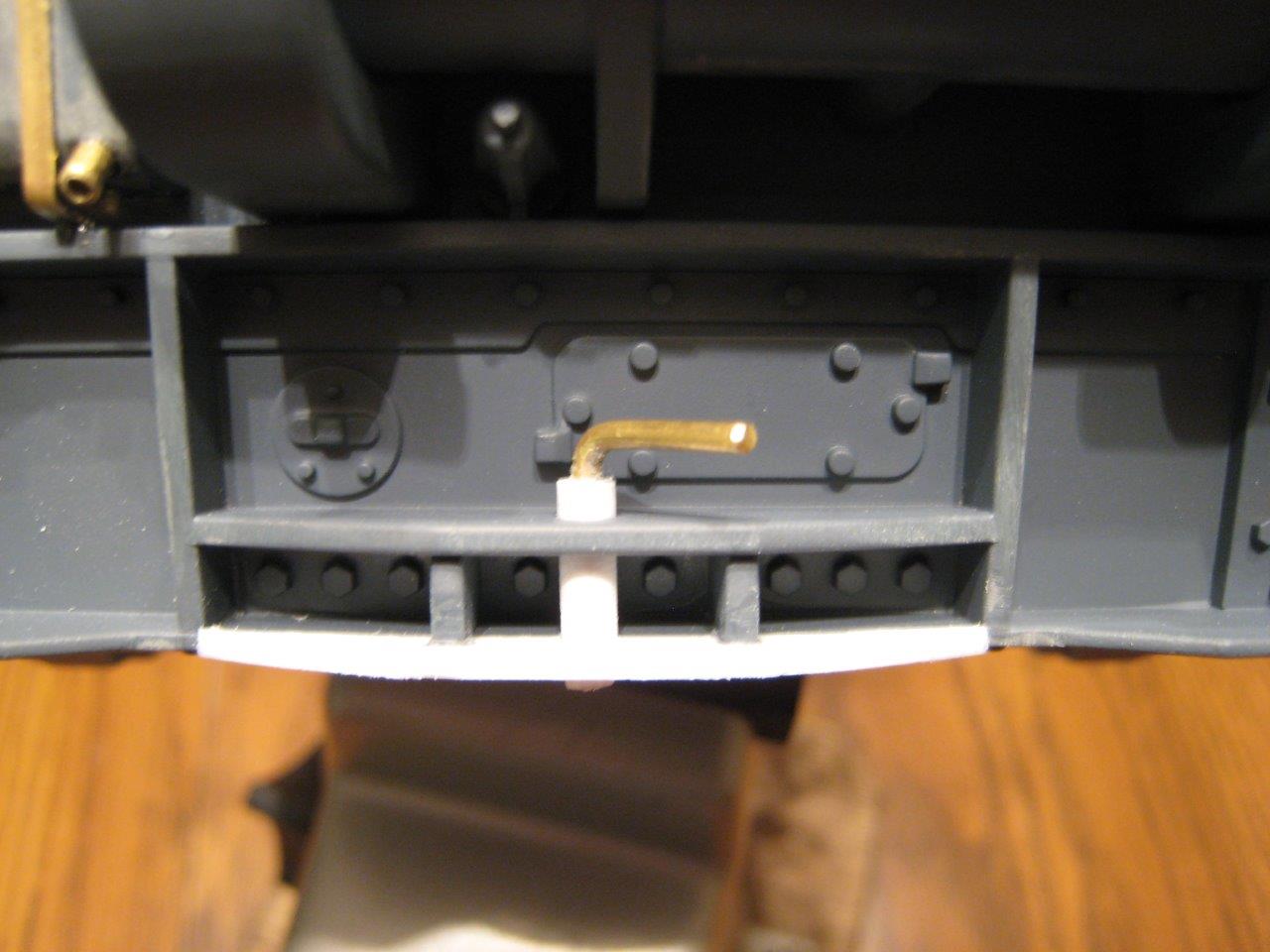 Detailing on the rear is finished. The auxiliary muffler is held in place with metal straps. The moldings needed to be replaced. The attachment isn’t perfect but close. I also added the small exhaust pipe using 2-mm brass tube.