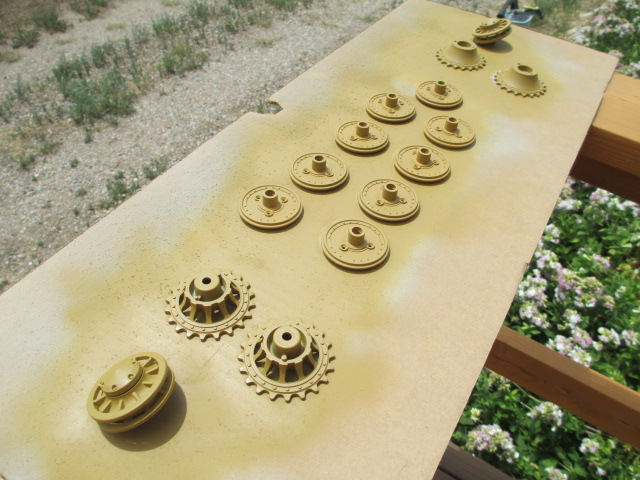 Post came yesterday with a very nice Aber aerial for the tank. This type will let me use my miniature spring set to make it fully functional. Spent the afternoon primering and spraying what seemed like a 100 road wheel pieces along with the sprockets and idlers. They can cure tonight and I'll assemble all of this tomorrow. ;o) Pics: