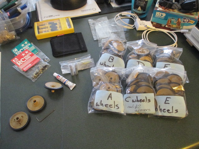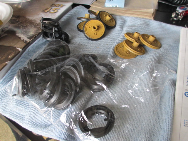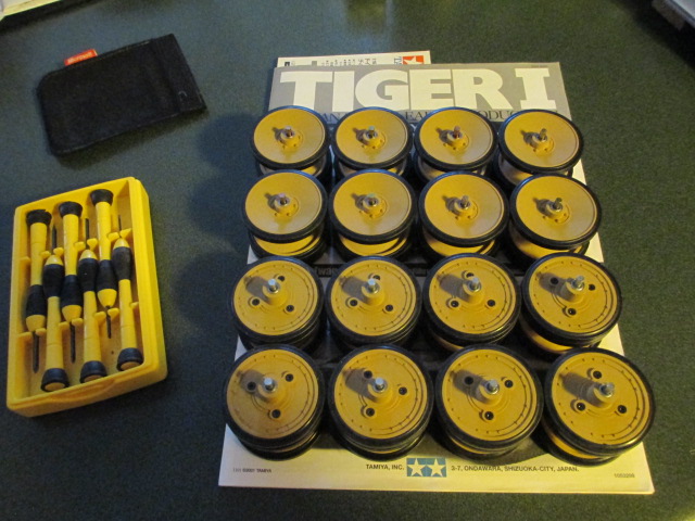 Post brought a set of Taigen Tiger 1 headlights last Saturday. I need the LEDs and wiring out of them. Also, weekend is over so on to Step 13. Bearings were located and Tamiya's brass bushings set aside. It's not even work doing this kind of repetition when everything is so well engineered. Even Tamiyas little pot metal multi-wrench makes a perfect bearing press so things sit evenly. The idlers did not have to be assembled as Mike had provided excellent metal early types with bearings already. Pics: