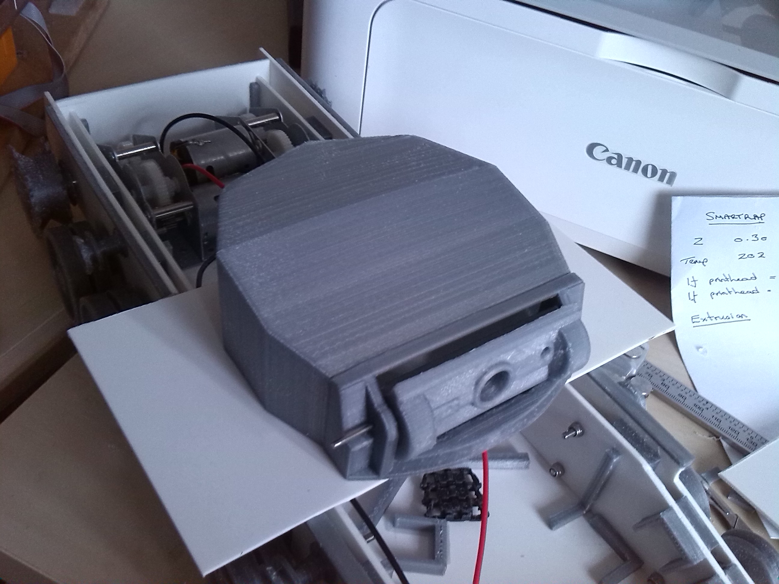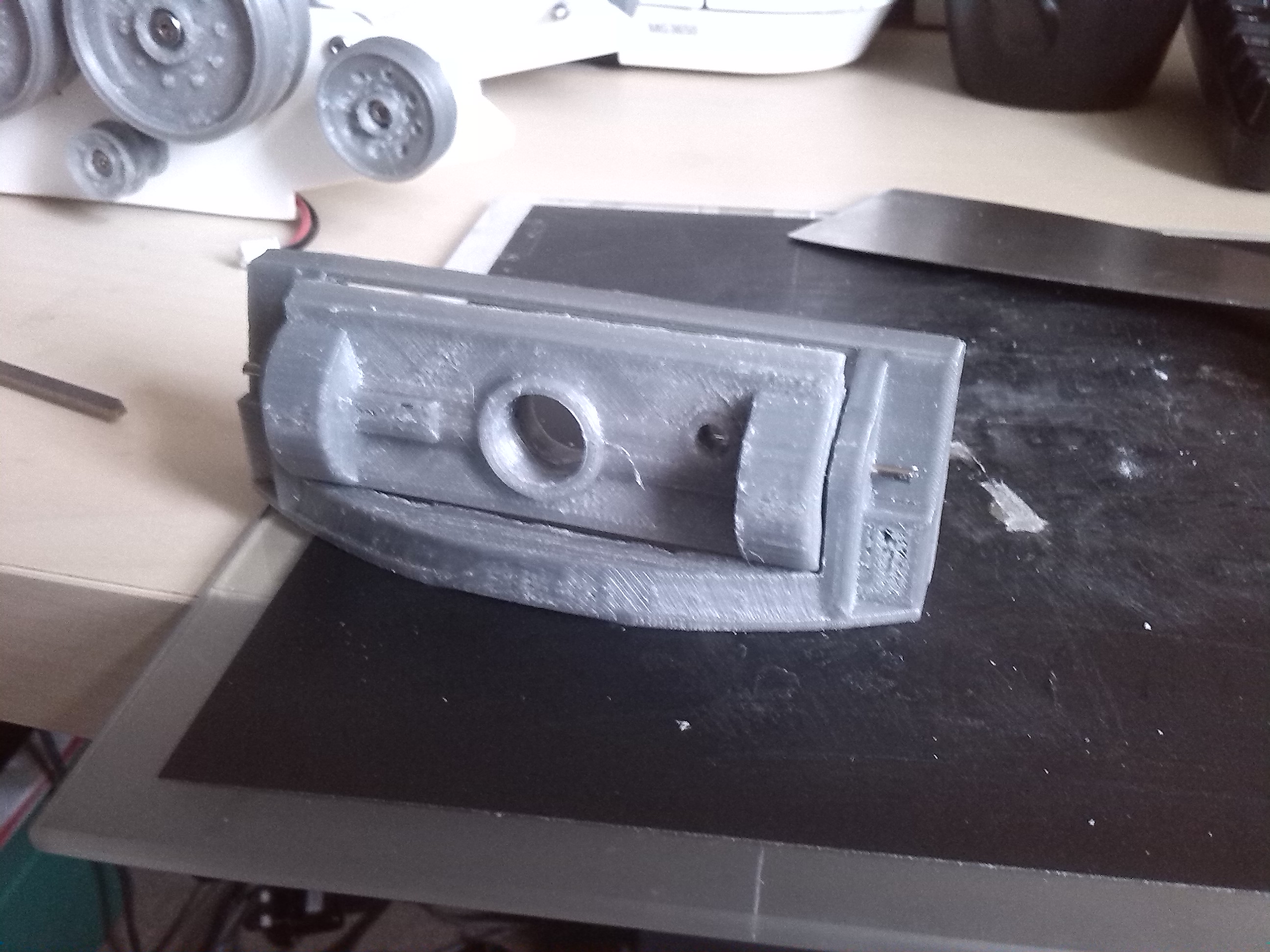 Took three attempts to get the mantlet right so that elevation would would smoothly. What looks ok in a CAD drawing doesn't always translate to the real world. This will all be smothered with Milliput to give a rough cast finish, so detail wasn't an issue on the print settings. There is a cavity for the IR led to slot in behind the machine gun hole.