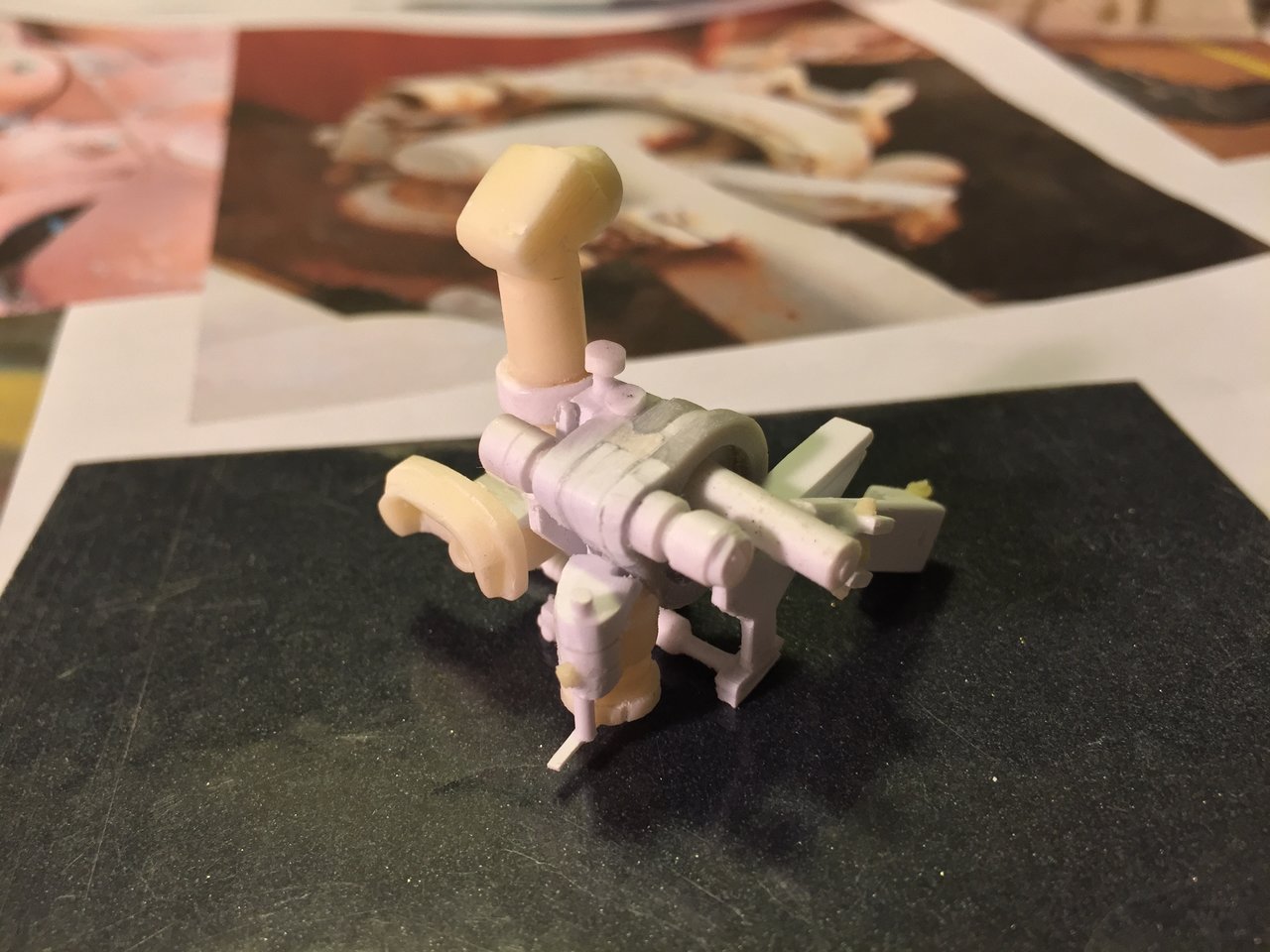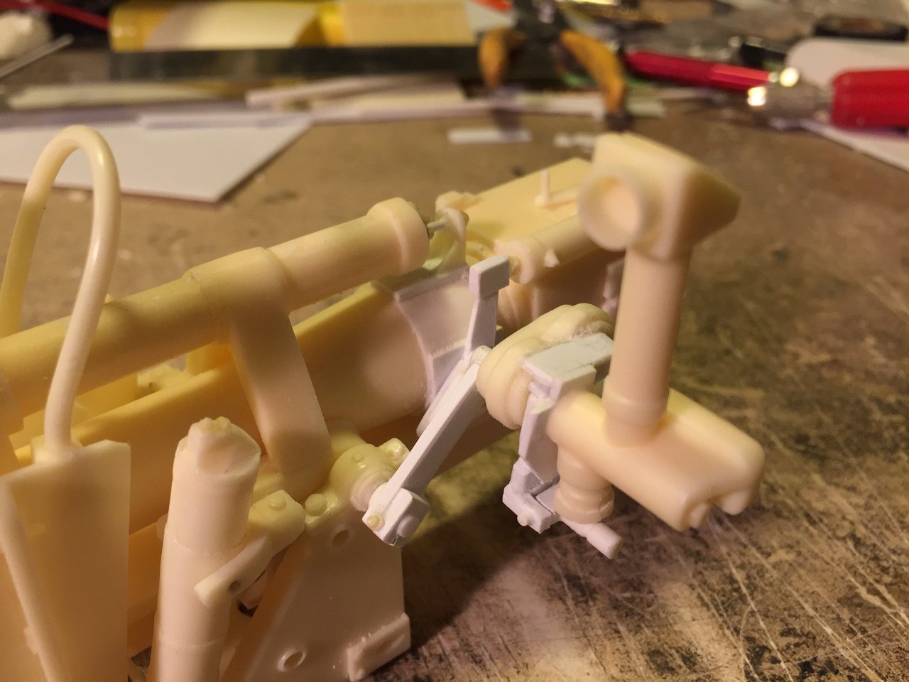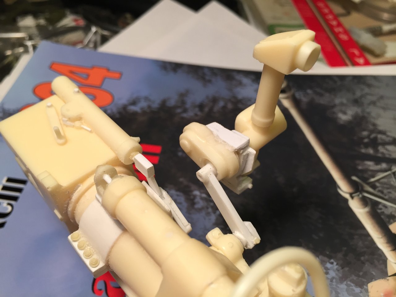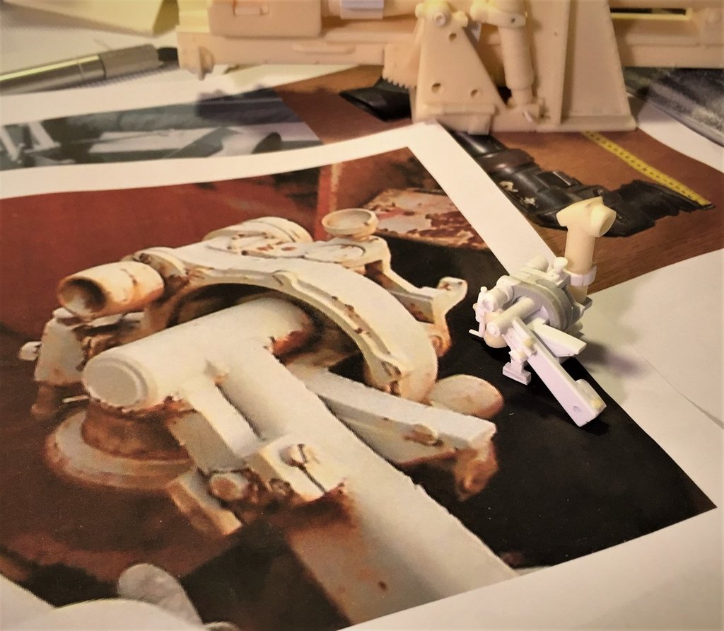 I started some basic detailing of the gun. The gun sight apparatus is quite complicated to build. It is difficult to replicate without a 3D model and only using few pictures with some angles. I gave the part only some resemblance to the real thing. I cut many corners by reusing the part coming with the kit in order to maintain my sanity. I always disliked gun sights for the same reasons...