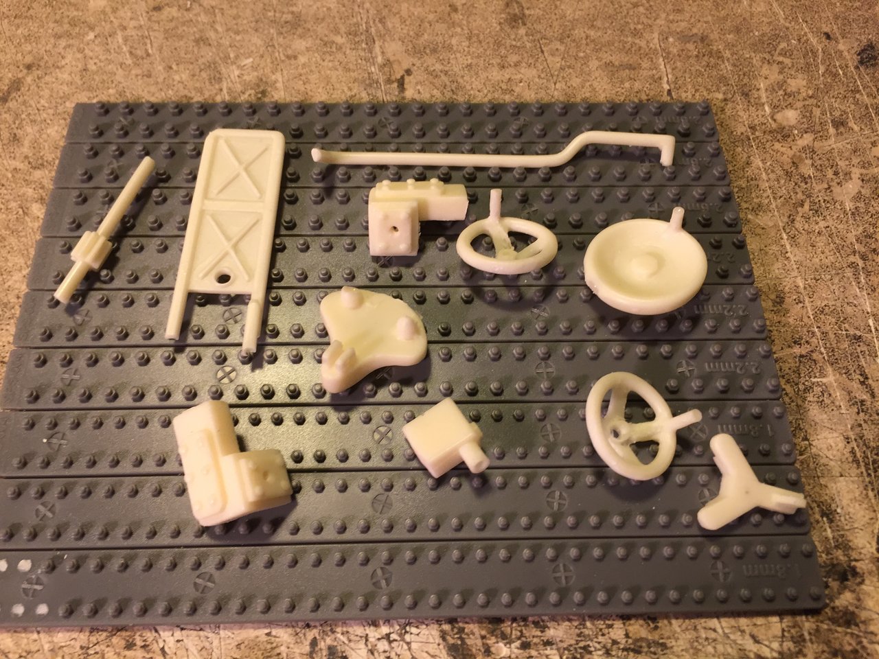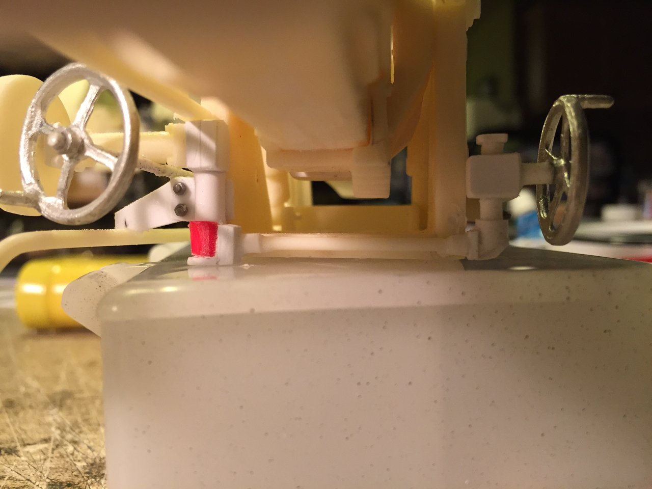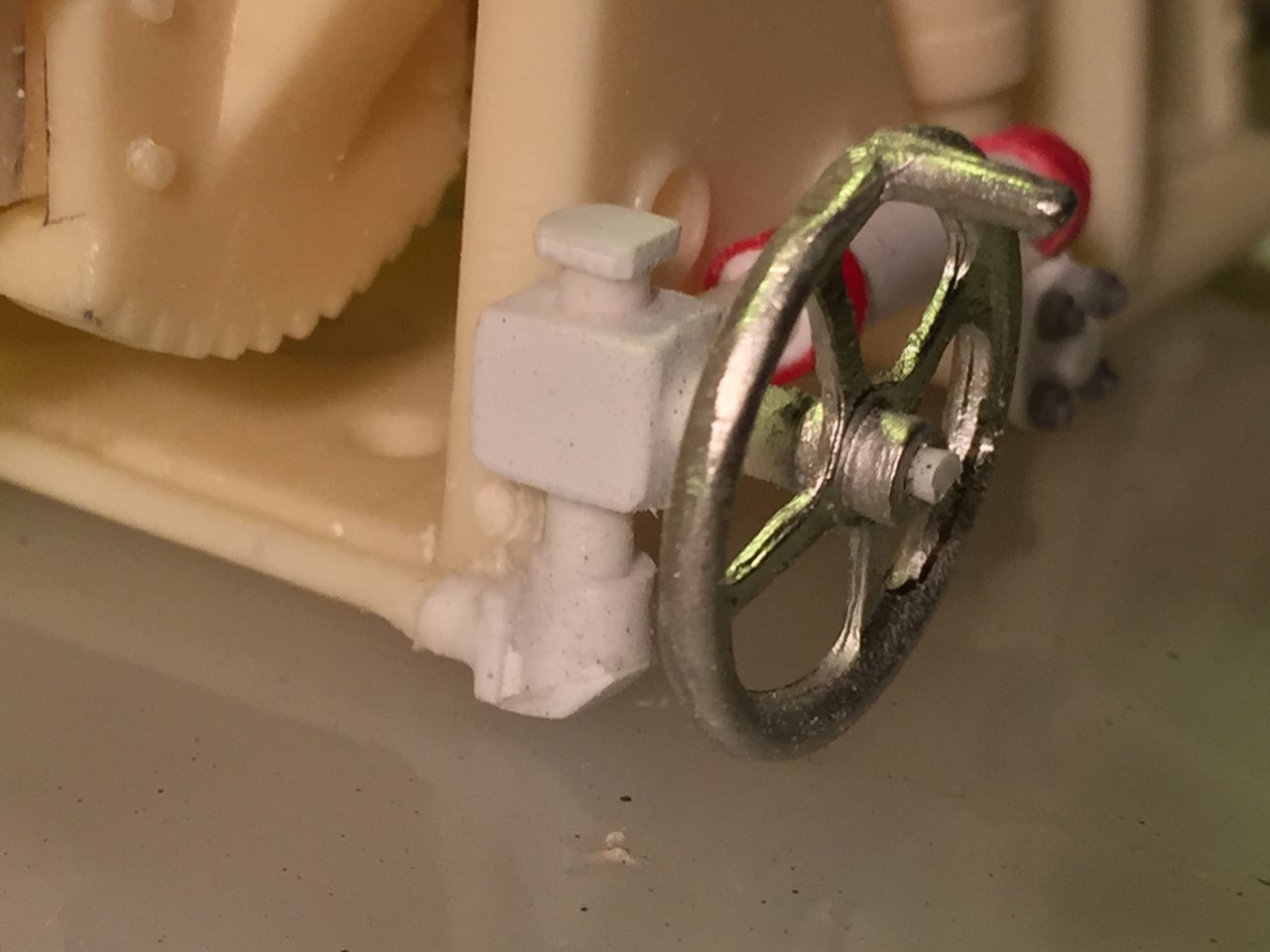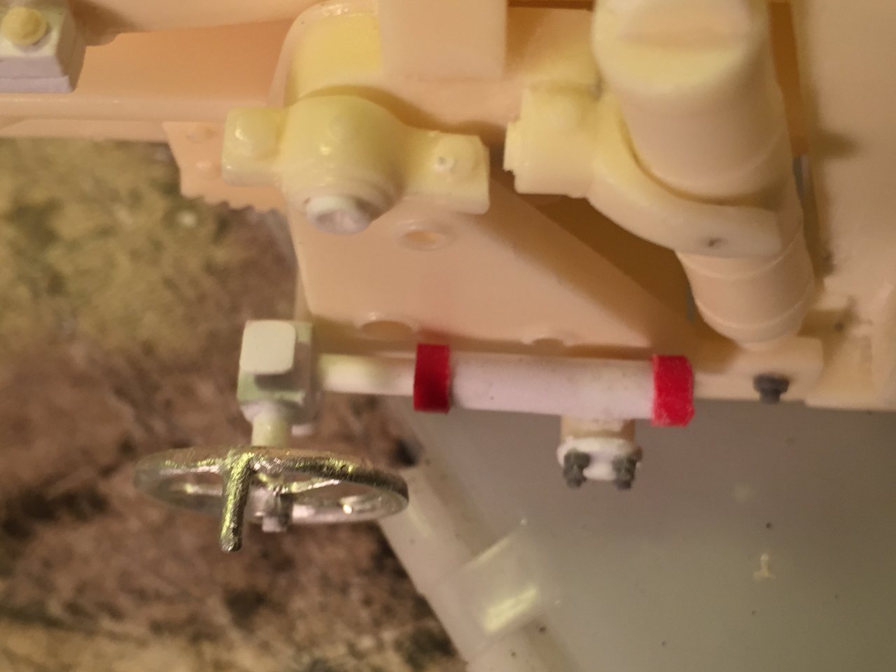 Here is the new right side with plasticard tubing and whatever I could find in the house to help. Two of the kit resin hand wheels had the wrong shape and were replaced by very accurate ones found on ebay for a couple of euros. Much better.