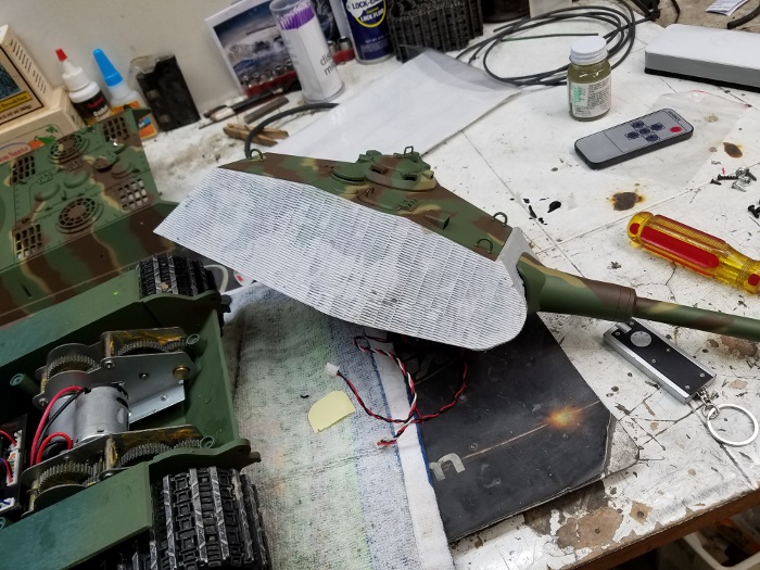 Well I got the wiring done. What a pain in the patoot are those little JSC thingies. I finally soldered them together as there wasn't any way they would work well on the tiny wires that came with the turret 360 unit. And I started the Zimmerit - not really bad yet. I am using the watery liquid glue that seems to work OK. Put a lot of glue on, lay a little bit of the Zim, more glue, more Zim - fun stuff - - -