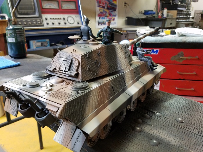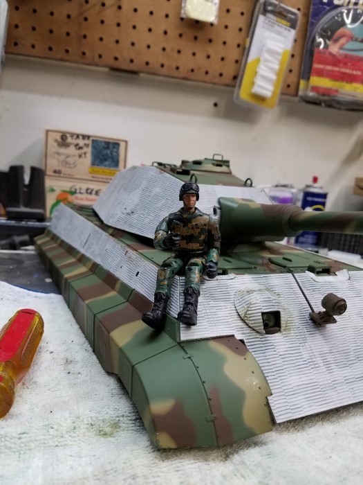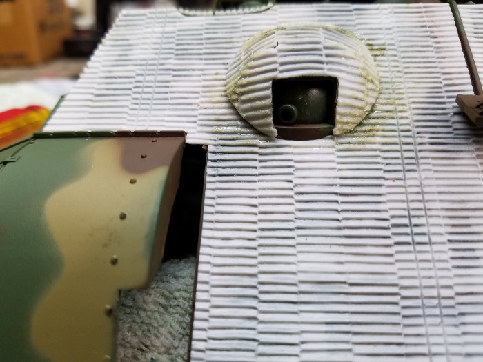 Zimmerit day, well I didn't get it all done but a significant portion. The little machinegun port was the most challenging. It was coat with glue, hold in place, add some super glue, hold in place, more glue, hold in place, then more super glue to get it all meshed together. I used the super glue as a bit of a filler and tightened up the Zim lines with it. If it is still on there tomorrow I will use a warm screwdriver to make a few adjustments in the lineup of the thing. But so far so good. Even got a coaxial machinegun in place. It came with one of the little troops I bought off ebay for a buck. 1/18 scale is not so far off from 1/16 if placed judiciously it appears.