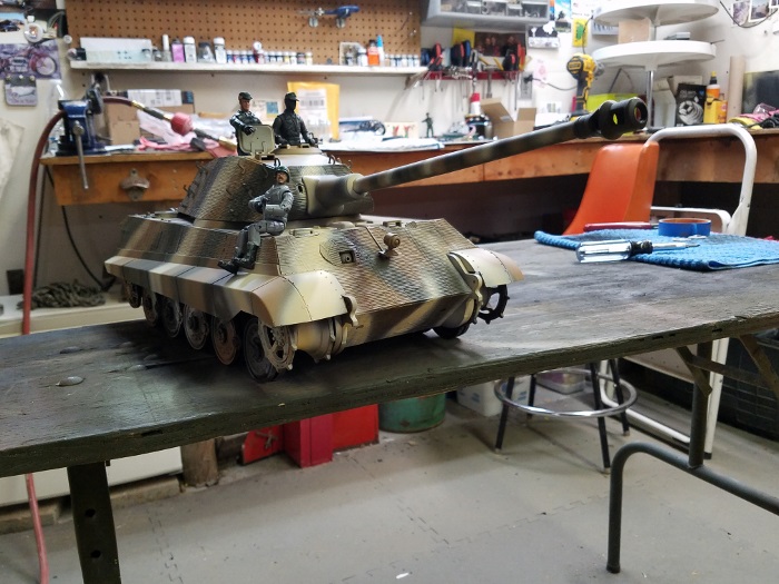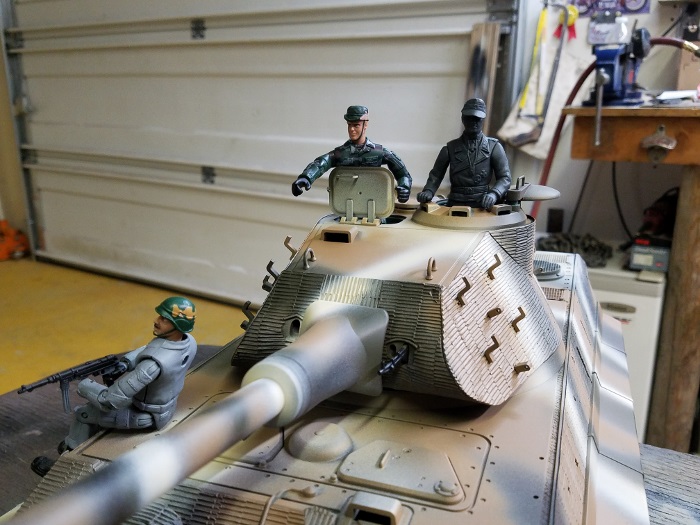 Tank camo os finally done. I really like using the airbrush but discovered it needs cleaned before you do anything else. Anyway - here's my idea of camo and a beginning of using the 1/18 troops.