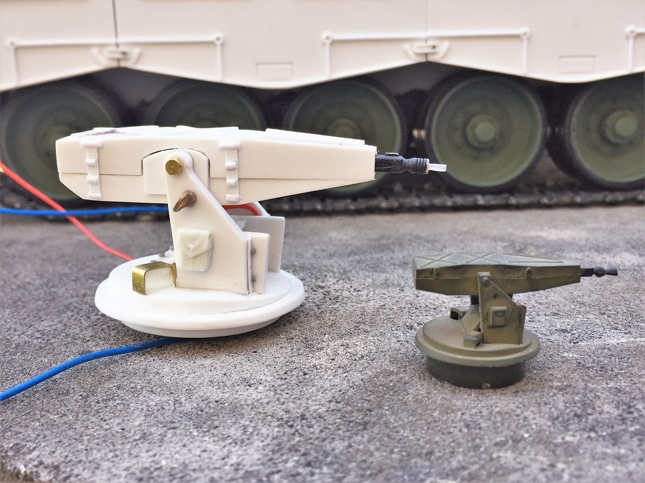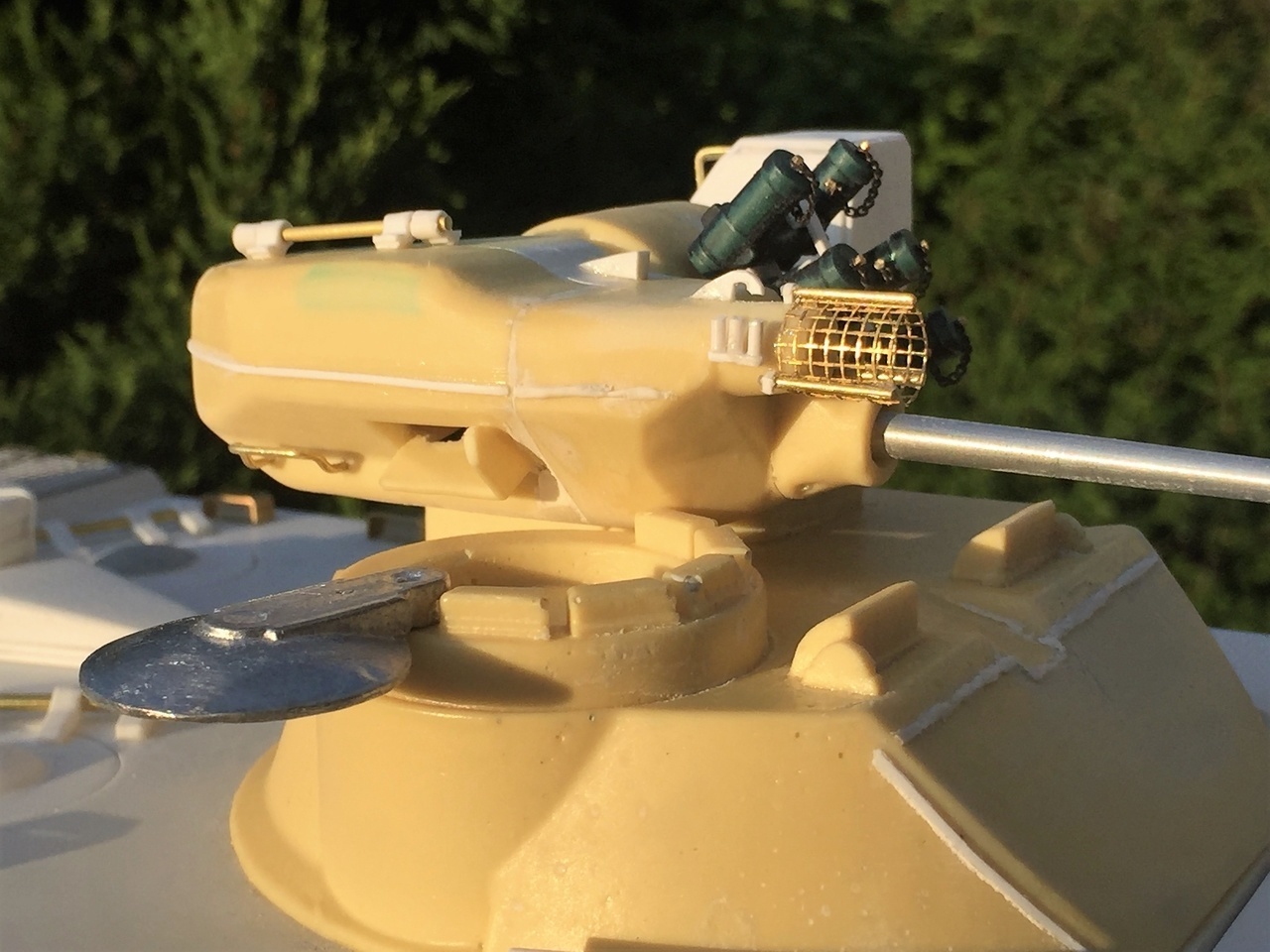 The IR box was scratch built using dimensions from the 1/35 kit and extrapolated to 1/16. It moves up and down with the gun. Only a few shady pictures are available of the 1A1 early arrangement. Be aware that various modernization efforts changed the look of this equipment over time. I did my best.
