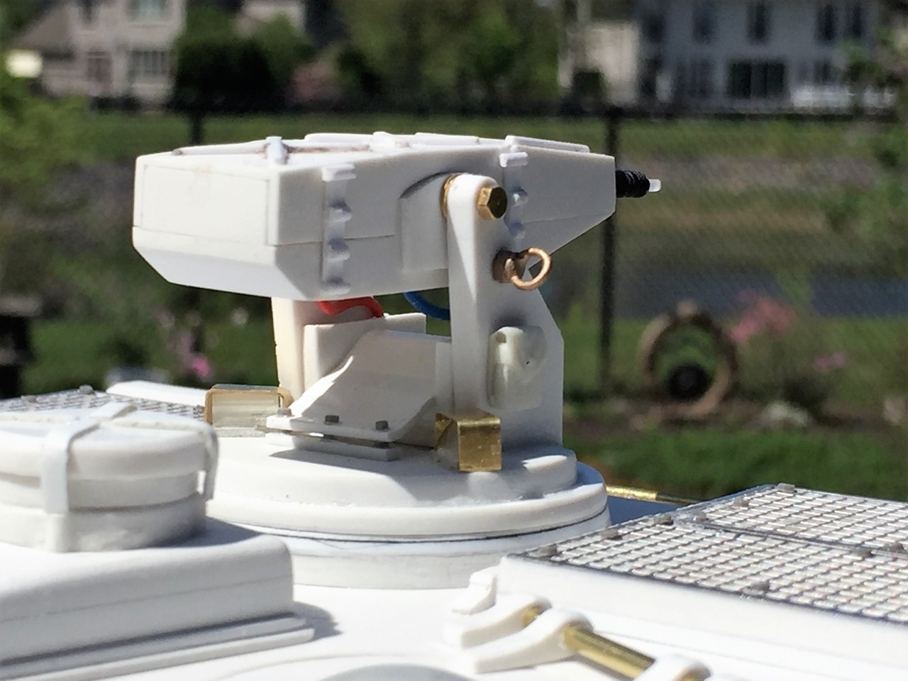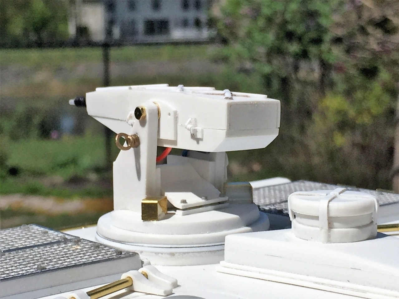 Here is what did to bring some rotation to the rear MG. It is a mid size servo attached to one of the VR knob and hidden within the right radiator area, connecting to the small turret with a simple push rod. View from the top and gun flash cables still to be connected.